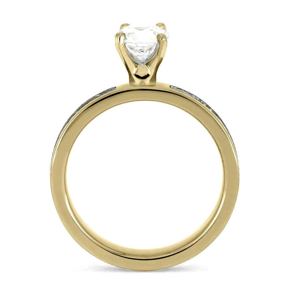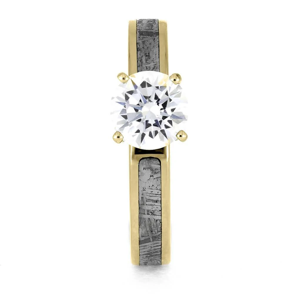 This 1.0 ct engagement ring showcases a breathtaking meteorite inlay, adding a unique touch to the timeless design of a wedding ring. The round cut diamond elevates the elegant aesthetic and flawlessly complements the mesmerizing Gibeon meteorite pattern.