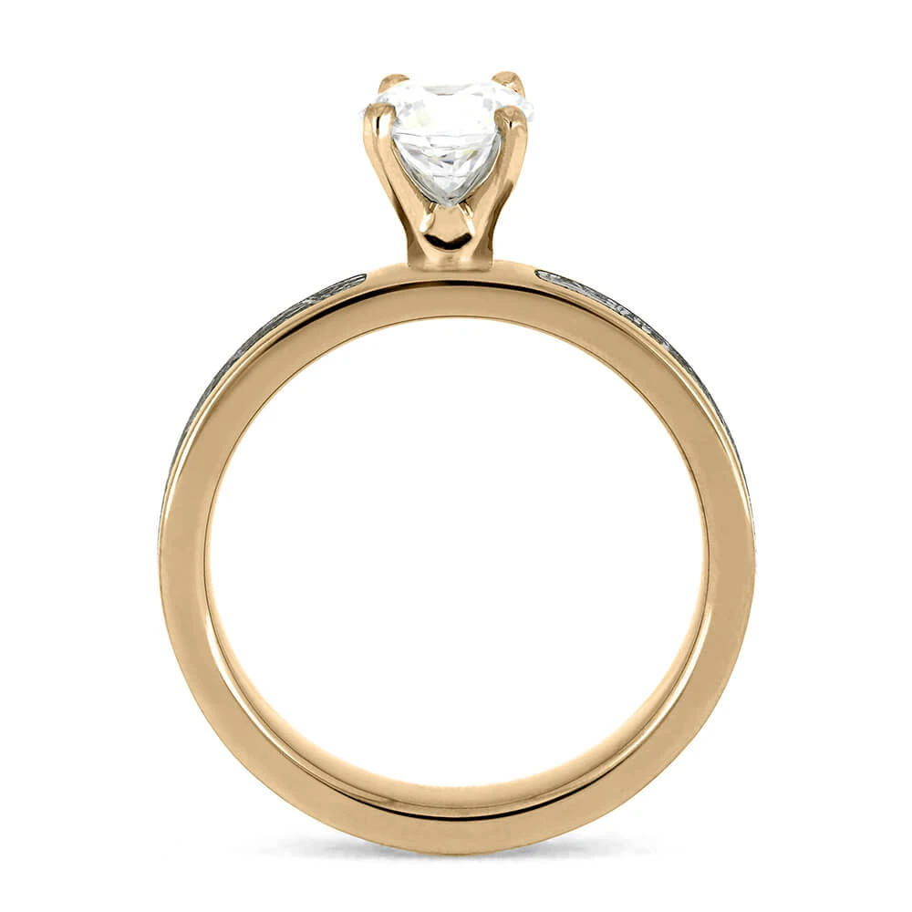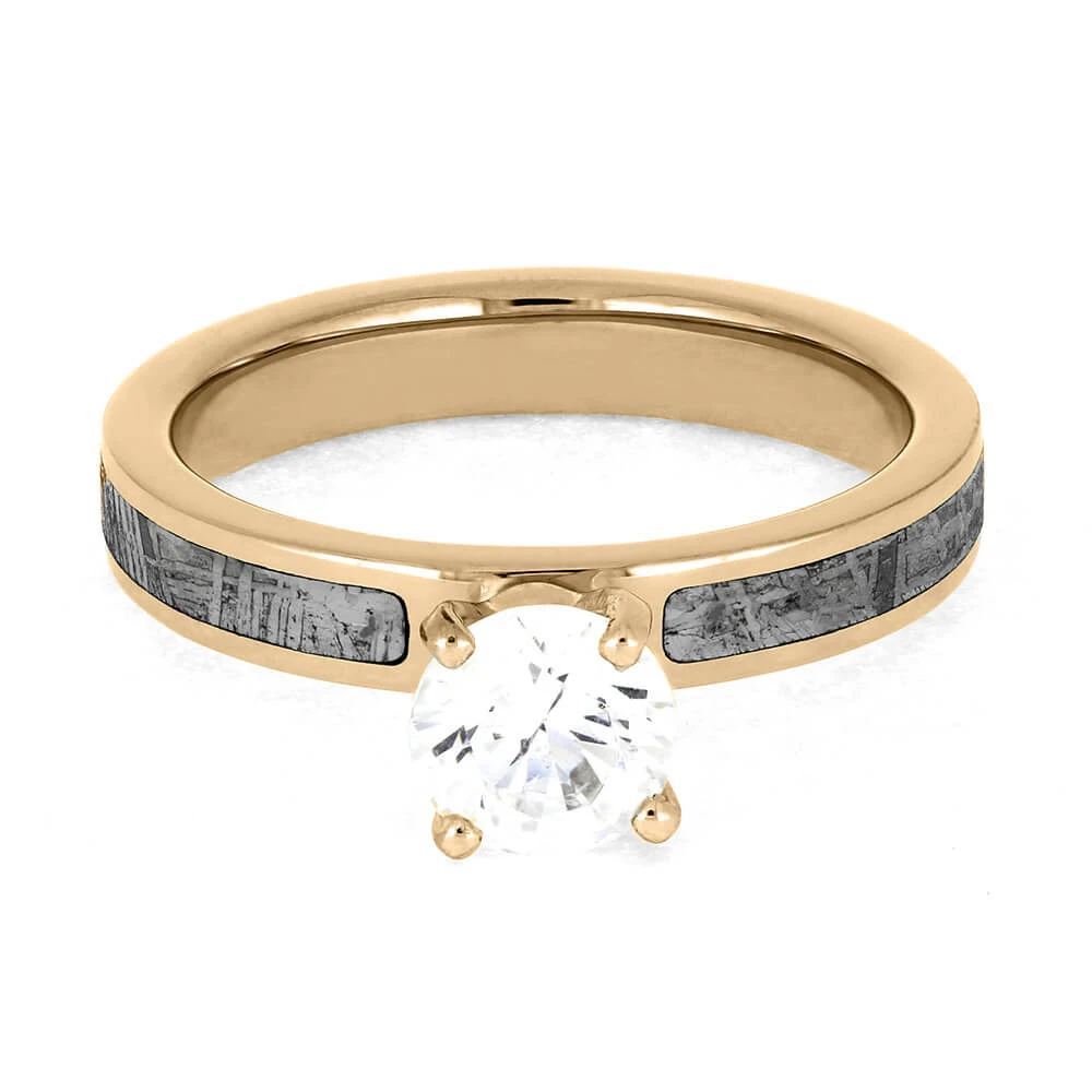 This 1.0 ct engagement ring showcases a gorgeous meteorite inlay, bringing a unique touch to the traditional wedding ring design. The round cut diamond enhances the timeless look and perfectly complements the alluring Gibeon meteorite pattern.