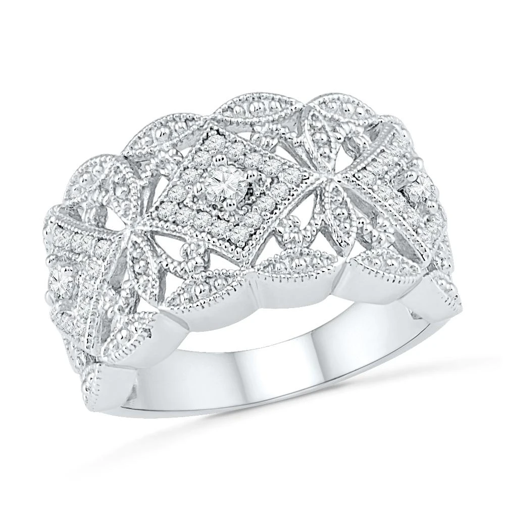 Crafted in your choice of white gold or sterling silver, this diamond vintage-style ring exudes romantic elegance. This ring is intricately designed to be reminiscent of a vintage-style ring without the high cost. It features 1/3 ct. t.w. of diamonds and has a high polished finish.