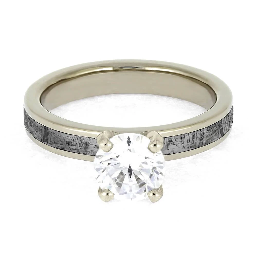 Wear a real piece of outer space! This 1.5 carat wedding ring boasts a striking meteorite inlay, elevating the traditional style with a unique element. The round cut diamond enhances the elegant design and perfectly complements the alluring Gibeon meteorite pattern.