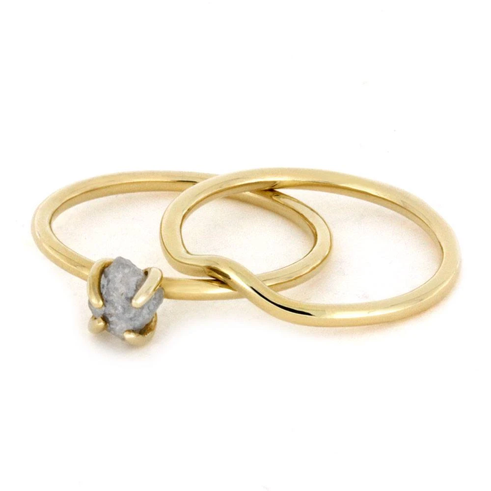 This 10k yellow gold bridal set is the perfect elegant pairing to symbolize your true love. The dainty wedding rings come together as one with a small pocket in the wedding band that wraps beautifully around the remarkable rough diamond. For the woman who embraces a the fact that less can be more this diamond engagement ring does not need flash to be absolutely stunning.