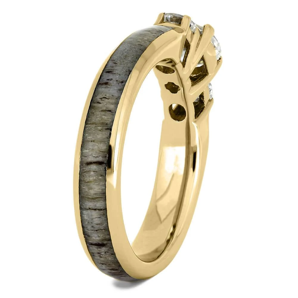 This yellow gold engagement ring is crafted from 14k gold and showcases three beautiful moissanites and a deer antler inlay. Its three stone design represents the past, present, and future, adding significance to this exquisite choice for your loved one. The inlay of antler is naturally shed, but you’re welcome to send us your own antler for an extra personalized ring!