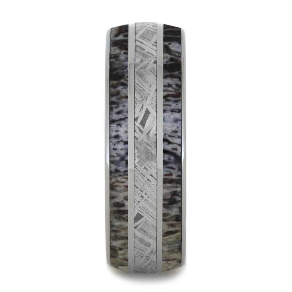 Keep your passion for the outdoors close at hand with this deer antler and meteorite wedding band! Set in rugged titanium, this handmade ring features a pinstripe of real Gibeon meteorite, making it an excellent conversation piece. We use naturally-shed deer antler for our antler rings, but you can send in your own sample for no additional charge!