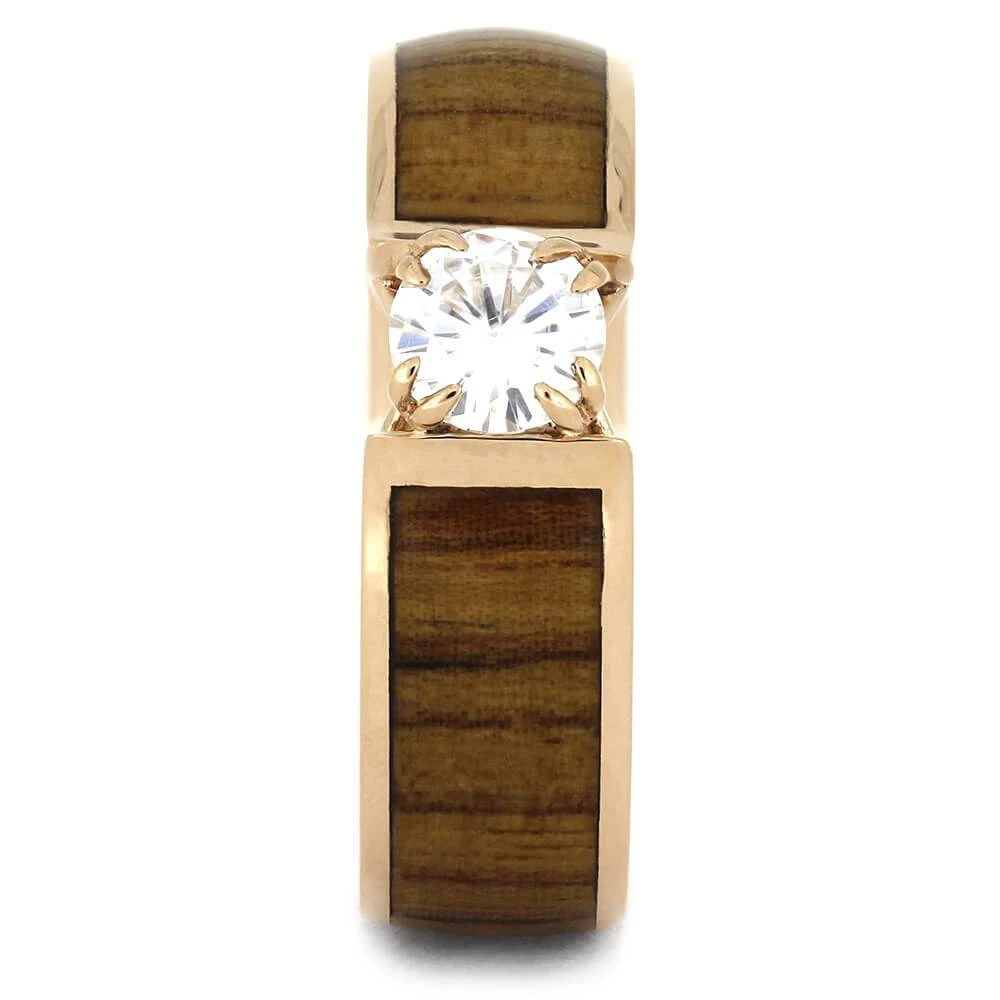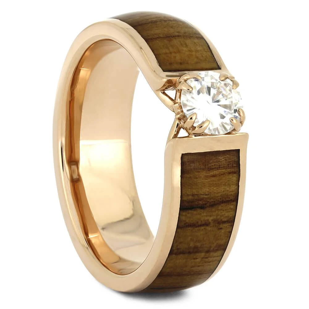 This nature-inspired round cut moissanite engagement ring features a gorgeous inlay of Honduran rosewood. The warm tones of the wood complement the polished gold in this unique handmade engagement ring. Another subtle and unique nod to nature’s beauty is the fact that the prongs securing the center stone are shaped like deer antlers. A perfect ring for any outdoor lover or hunter.