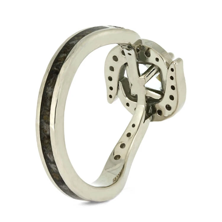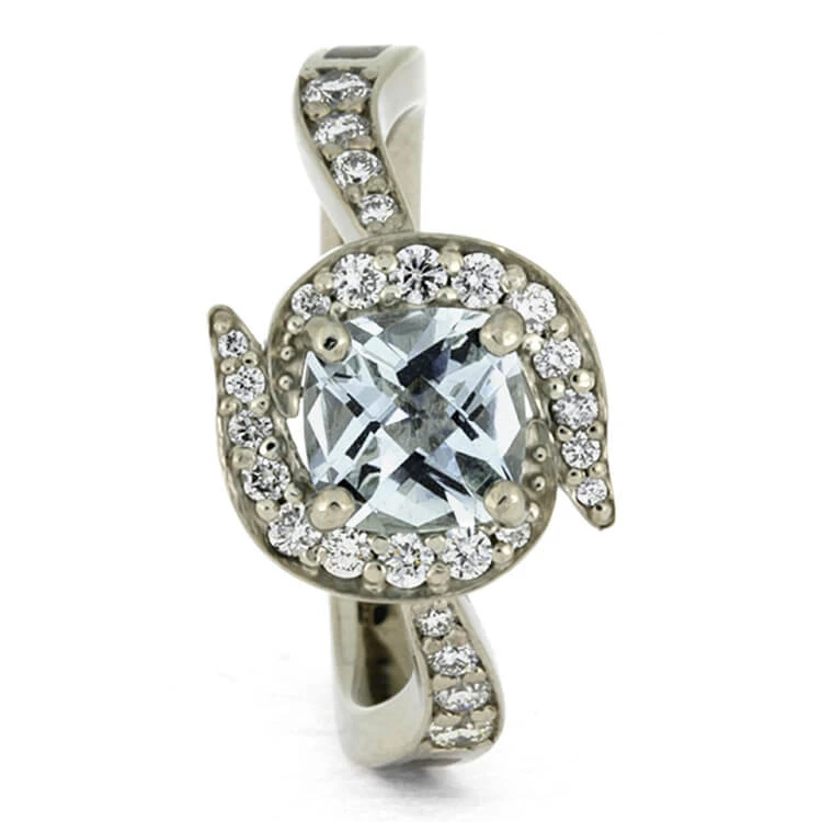 A halo of diamonds surrounds this beautiful aquamarine center stone. Set in 14k white gold, the curving shank displays a brilliant assortment of diamonds and a partial inlay of crushed deer antler.