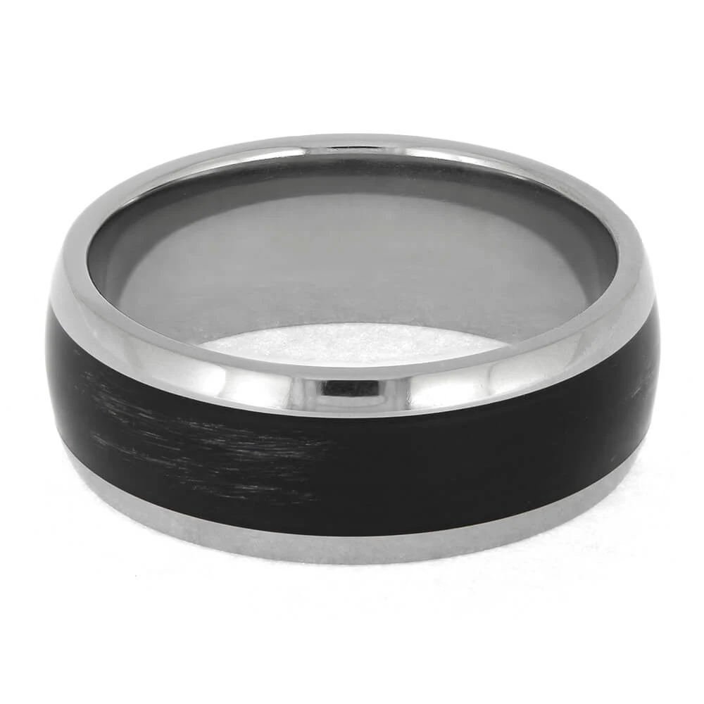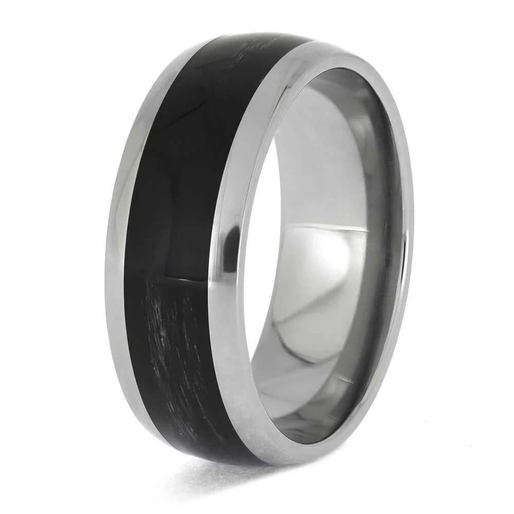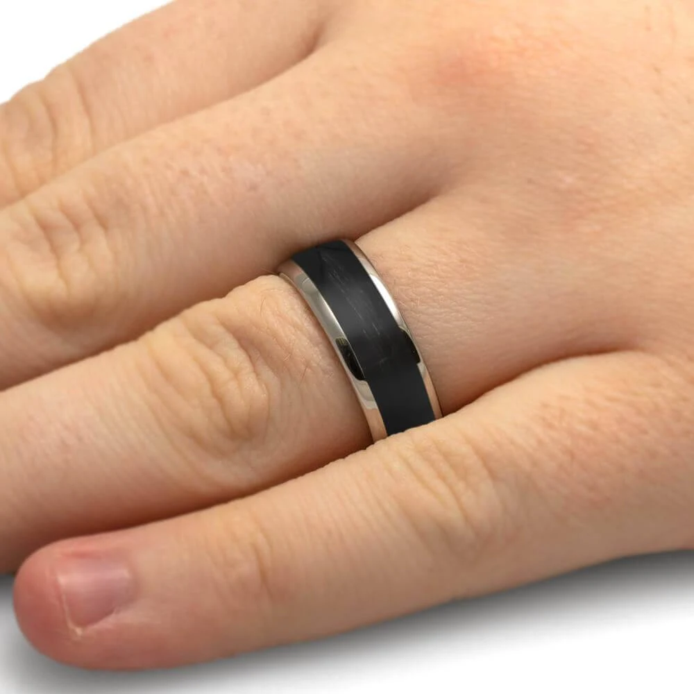 May your aim always be true with this bowstring wedding band! This custom ring is crafted with a black bow string in rugged titanium. The sturdy combo of materials shows off your passion for archery in a strong and durable fashion. Send us your own bowstring to make your custom ring even more unique!