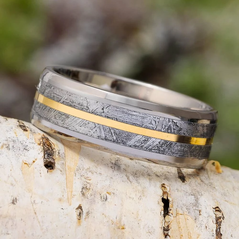 Down the middle of this men’s meteorite ring is a polished pinstripe of 14k yellow gold. The hint of warm color contrasts the silver tones of the titanium and Gibeon meteorite, The otherworldly pattern of meteorite makes this men’s wedding band a great choice for the groom who wants something unique.