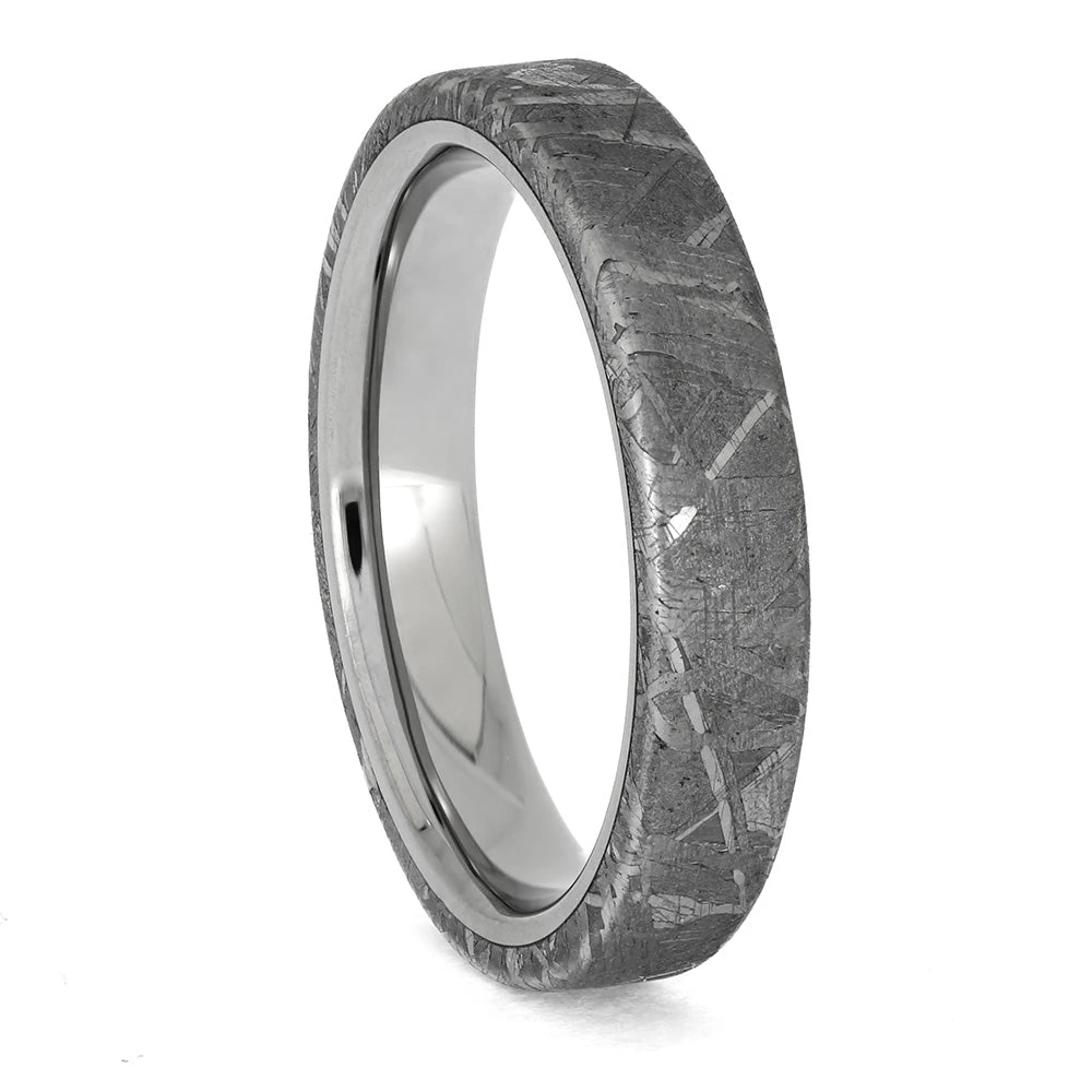 Wear a slice of outer space with this handmade meteorite wedding band! Authentic Gibeon meteorite is overlaid on a band of durable titanium. This hand crafted titanium ring has a comfort fit sleeve and a flat ring profile.
