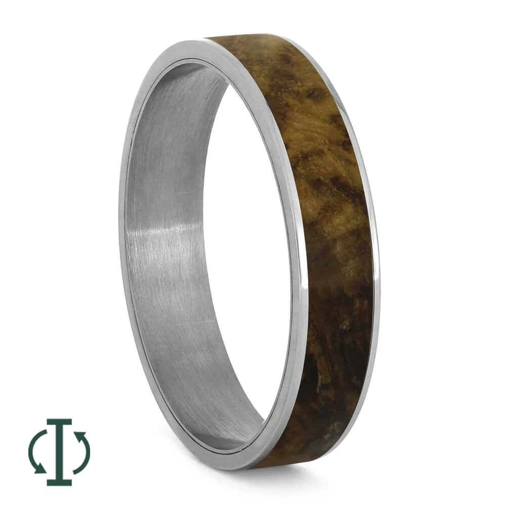 Natural patterns swirl in this Black Ash Burl Wood interchangeable component. This natural materials can be used in our interchangeable titanium twist rings, which allow you to customize your ring whenever you want.
