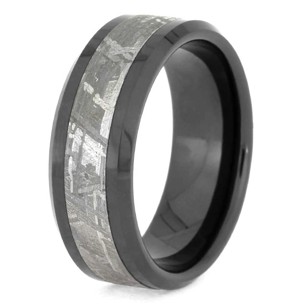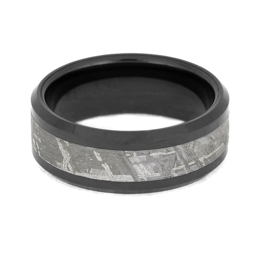 Crisp edges and intricate meteorite patterns make this beveled black ceramic ring a sharp addition to your style. Each ring’s Gibeon meteorite inlay is unique, with its own distinct Widmanstätten pattern. This space jewelry is a stylish and thoughtful gift for astronomers!