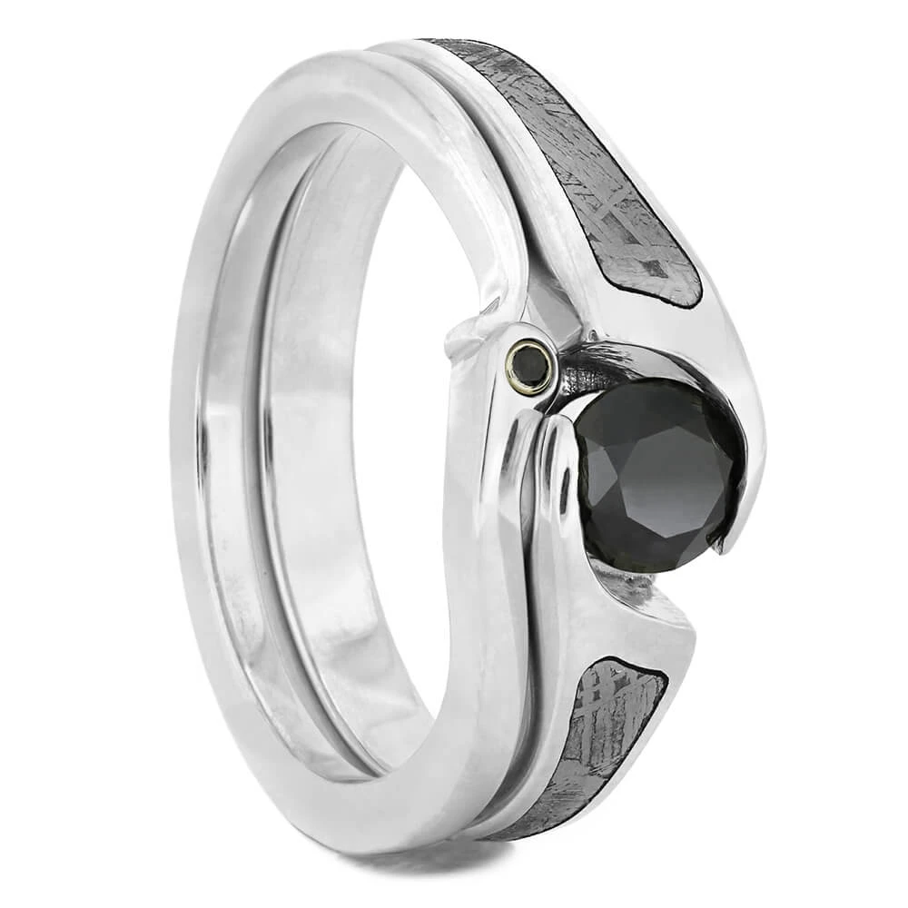 This bridal set features a tension set black diamond engagement ring with an authentic Gibeon meteorite inlay paired with a simple black diamond wedding band. Polished sterling silver is an excellent stage for meteorite to show off its unique and natural pattern, but this unique bridal set can be customized in a different metal of your choice!