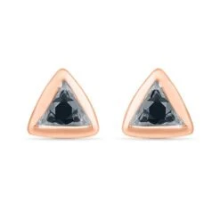 These small but stunning stud earrings are shaped like a triangle and feature a round cut black diamond. Crafted in perfectly polished 14k gold or sterling silver with push back closures.