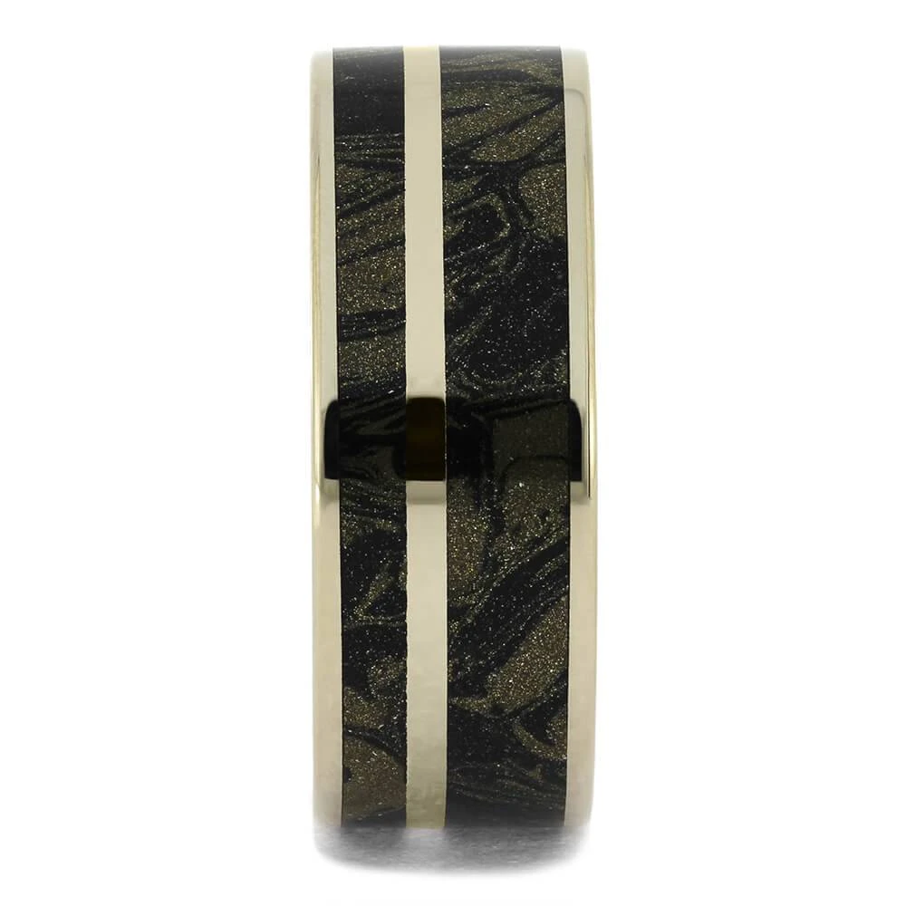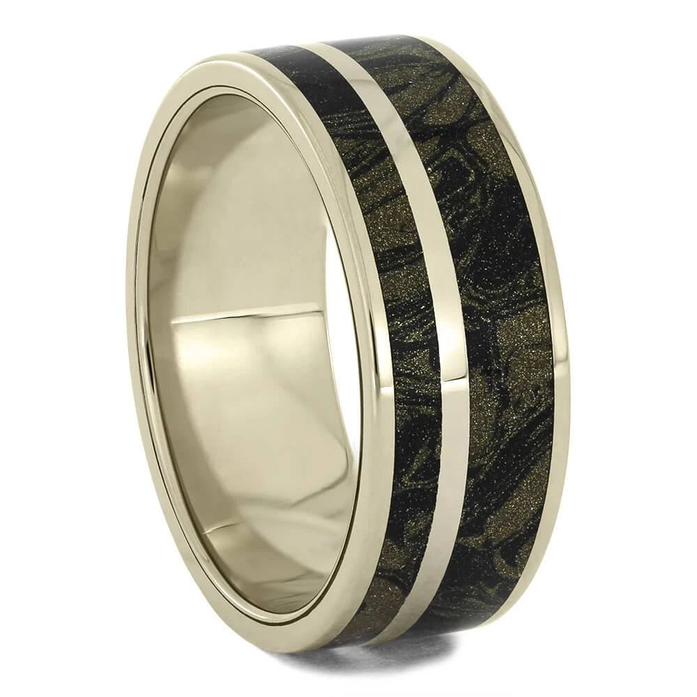 This stunning men’s wedding band features swirling, mokume gane. This composite, black and gold material can be inlaid in 14k white gold with an off-set pinstripe. Customize the ring to feature a different mokume gane color option if desired.
