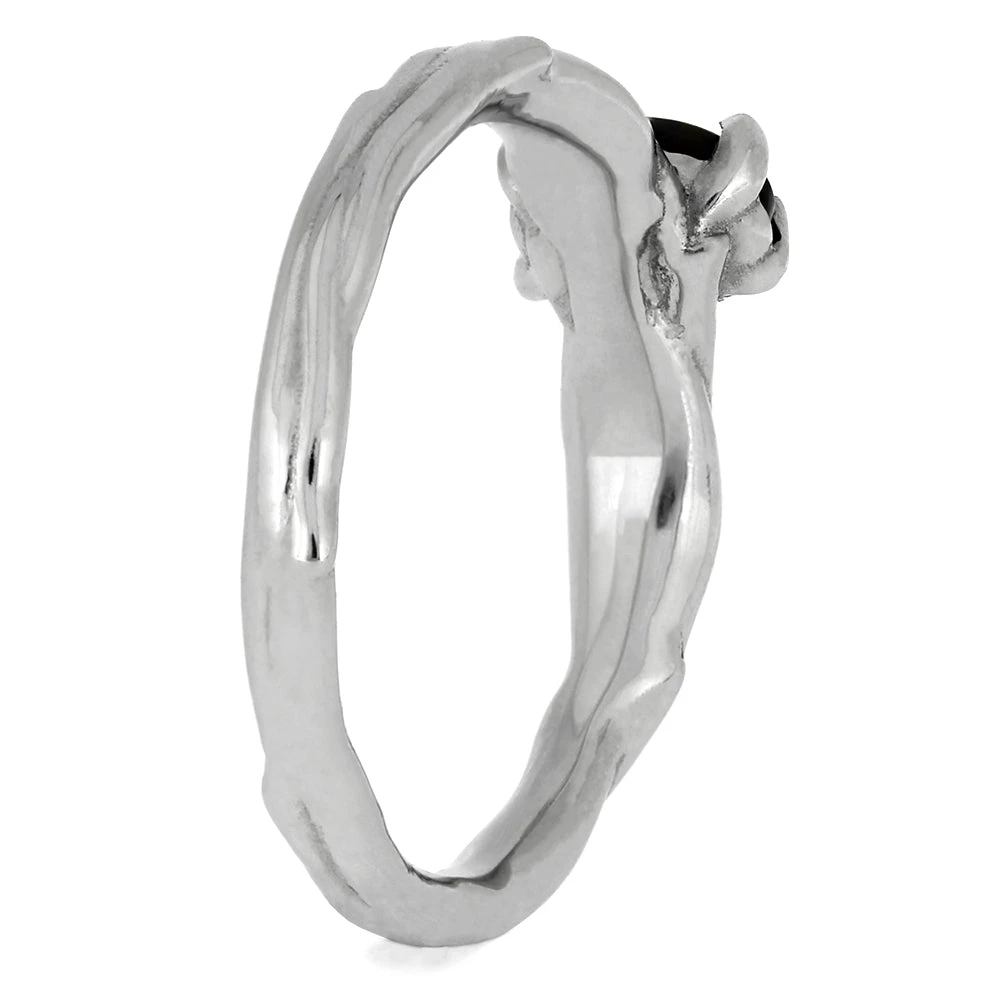 An astounding black opal engagement ring accented with real Gibeon meteorite. This platinum ring comes with a branch-like band. Gibeon meteorite engagement rings are unique and truly one of a kind because of their distinct Widmanstätten pattern.