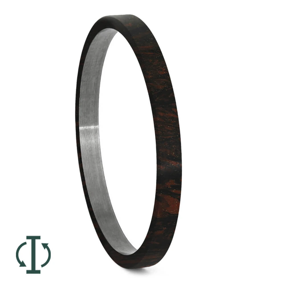 These black and red composite mokume gane inlays boast a pattern that resembles a dark, burning fire. A bold and beautiful look that’s unlike any other.