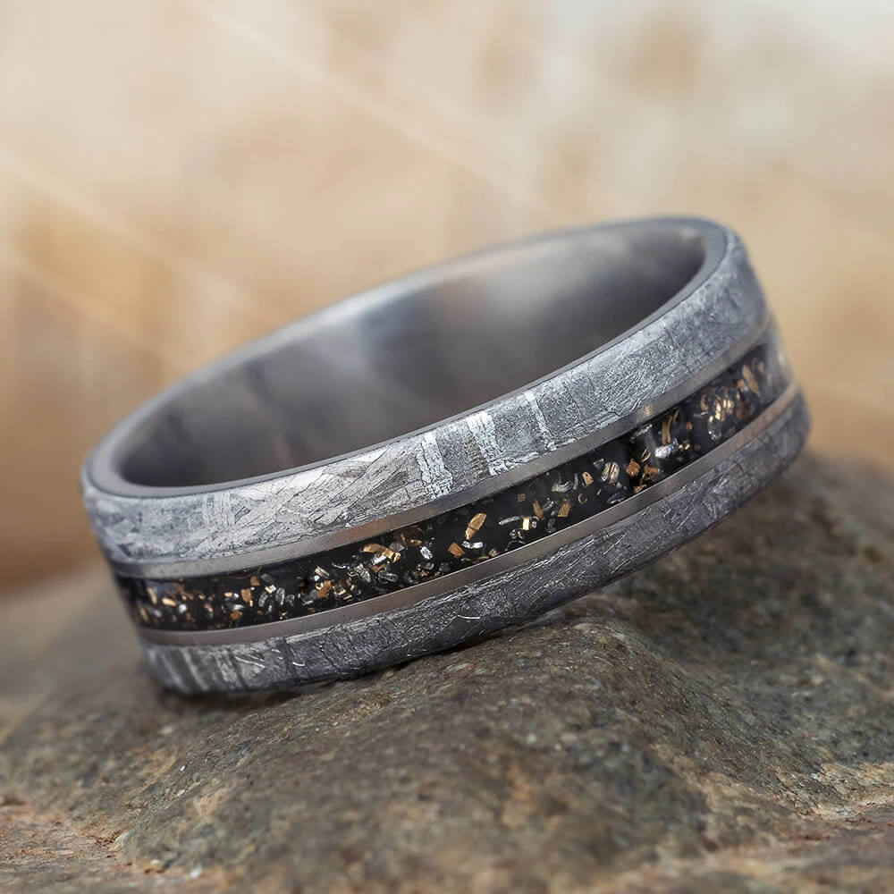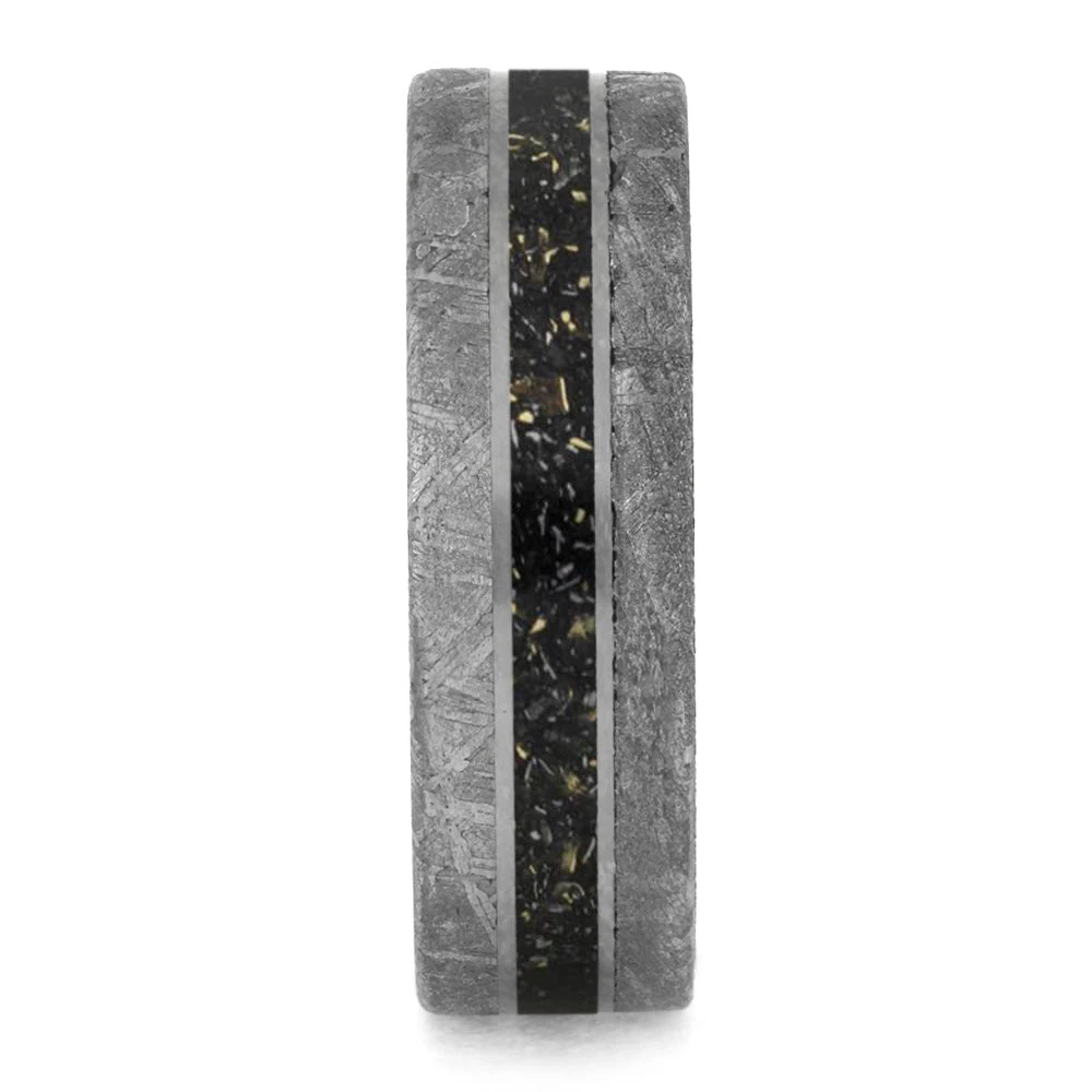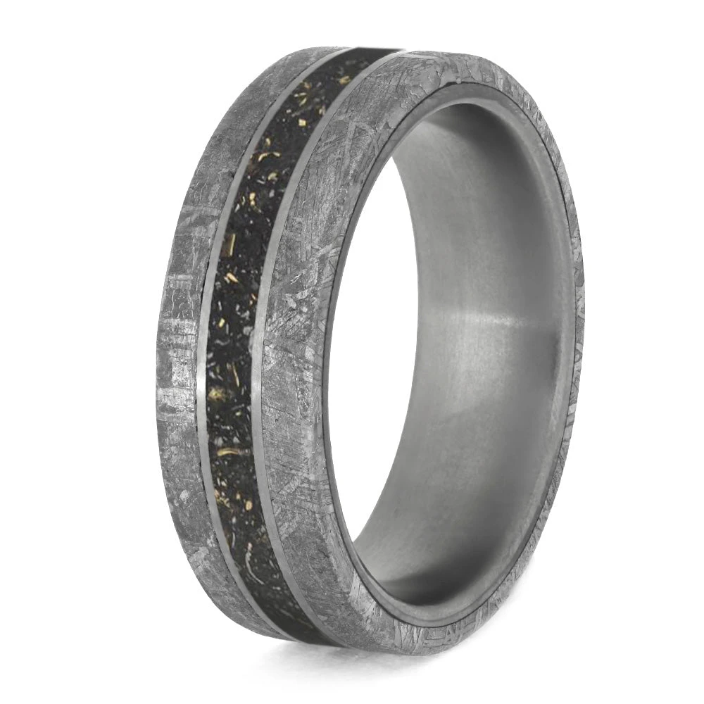 Seize the stars with this black Stardust™ and meteorite ring. Yellow gold flakes shine in the Stardust inlay, with genuine Gibeon meteorite running along the edges of this matte titanium ring.