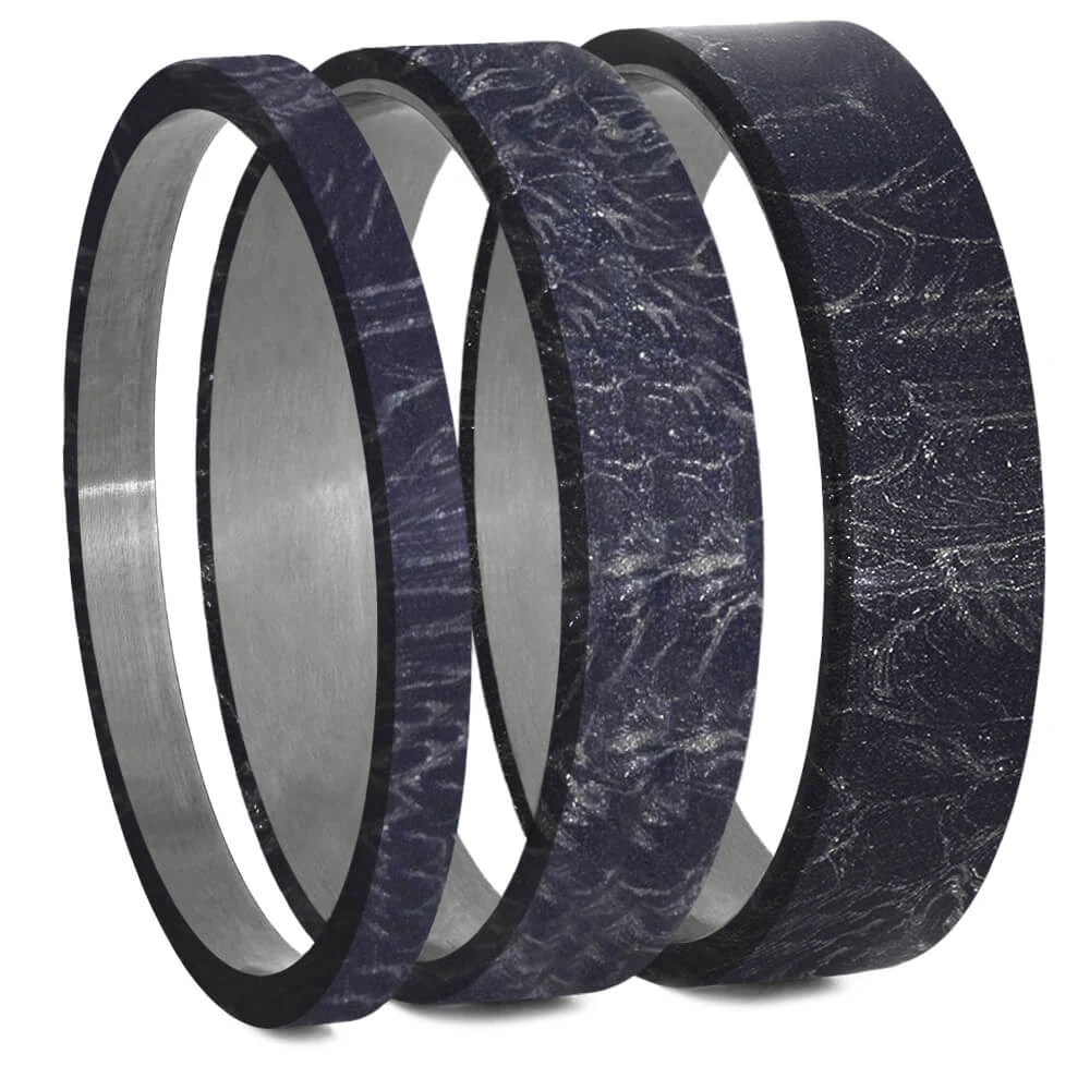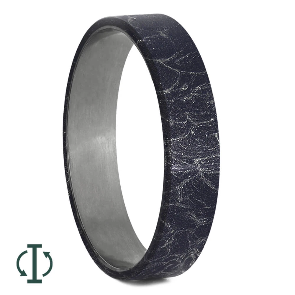 Our blue bronze and white mokume gane inlays resemble the dark and mysterious night sky. It pairs perfectly with any of our titanium interchangeable ring cores.