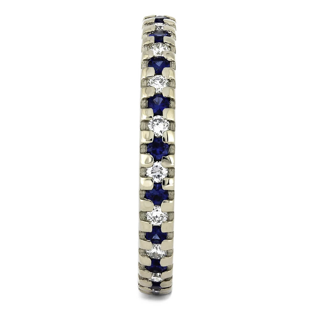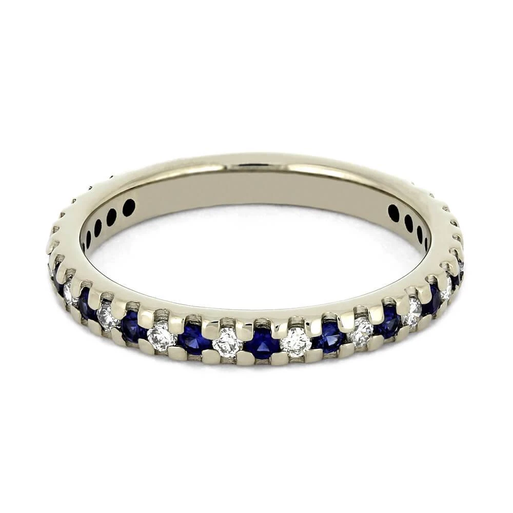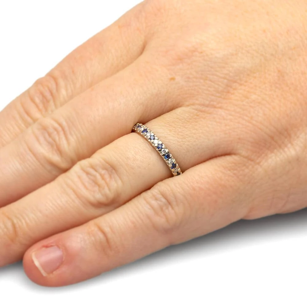 This gemstone wedding band alternates beautiful blue sapphires and dazzling diamonds. The stones are set in polished white gold and can elevate a matching diamond engagement ring.