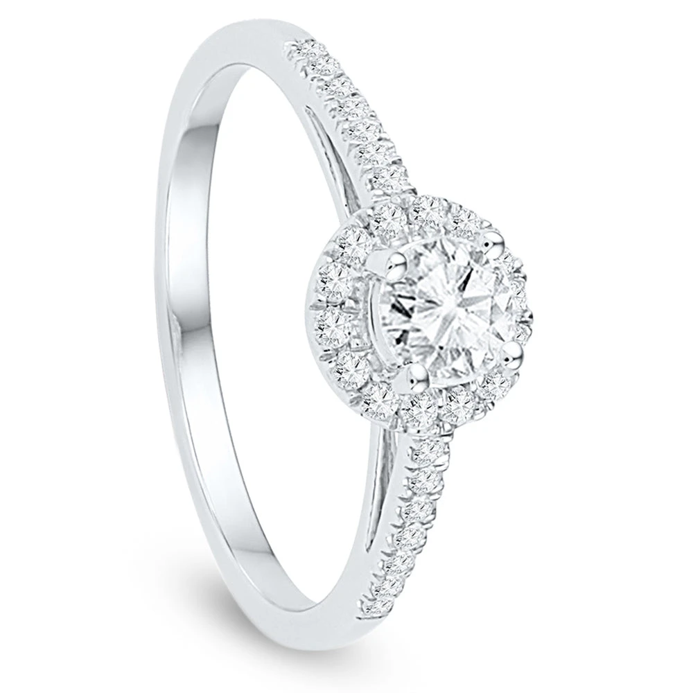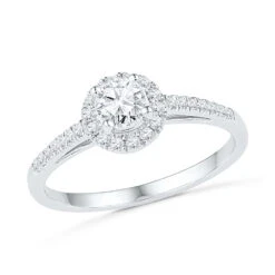 An absolute classic simple style, this brilliant engagement ring has everything your looking for. The engagement ring features a brilliant round center diamond accented by a circle of shimmering diamonds. The band has gorgeous diamonds and a very bright polished shine. This engagement ring has 1/2 carat total weight of diamonds and is available in sterling silver or gold.