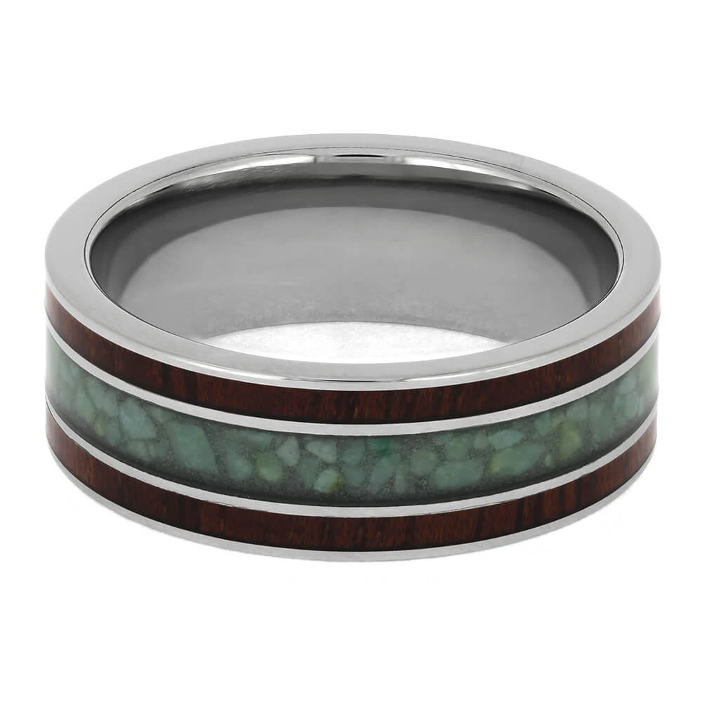 This colorful titanium-banded wood ring has bubinga wood and crushed chrysocolla for a vibrant and eye-catching design. Chrysocolla is a naturally-occurring mineral that is high in copper, which gives it a strong teal color. The titanium strips set each bold inlay apart and contribute to the durability of the wedding band. This wood jewelry is sure to draw attention with its flashy contrasting natural materials.