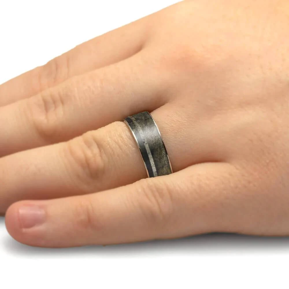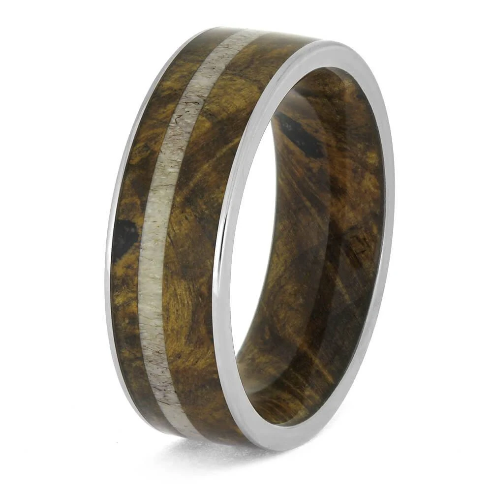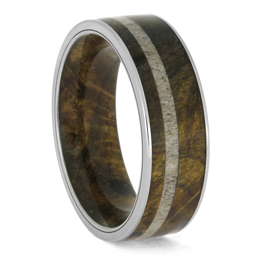 Embrace nature with this artisan-crafted wedding band made from buckeye burl wood and deer antler. Featuring a prominent deer antler pinstripe within the beautiful buckeye burl wood inlay, this men’s ring is finished with titanium edges for a sleek and rugged design. Explore the outdoors with this handmade nature ring!