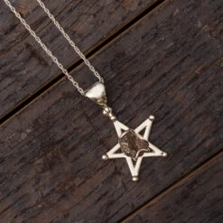 This unique necklace is made with sterling silver and has a nugget of Campo del Cielo meteorite in the center of the star pendant. Each piece of meteorite is unique in shape and size. This stunning pendant necklace has a sleek polished finish and lobster clasp chain.