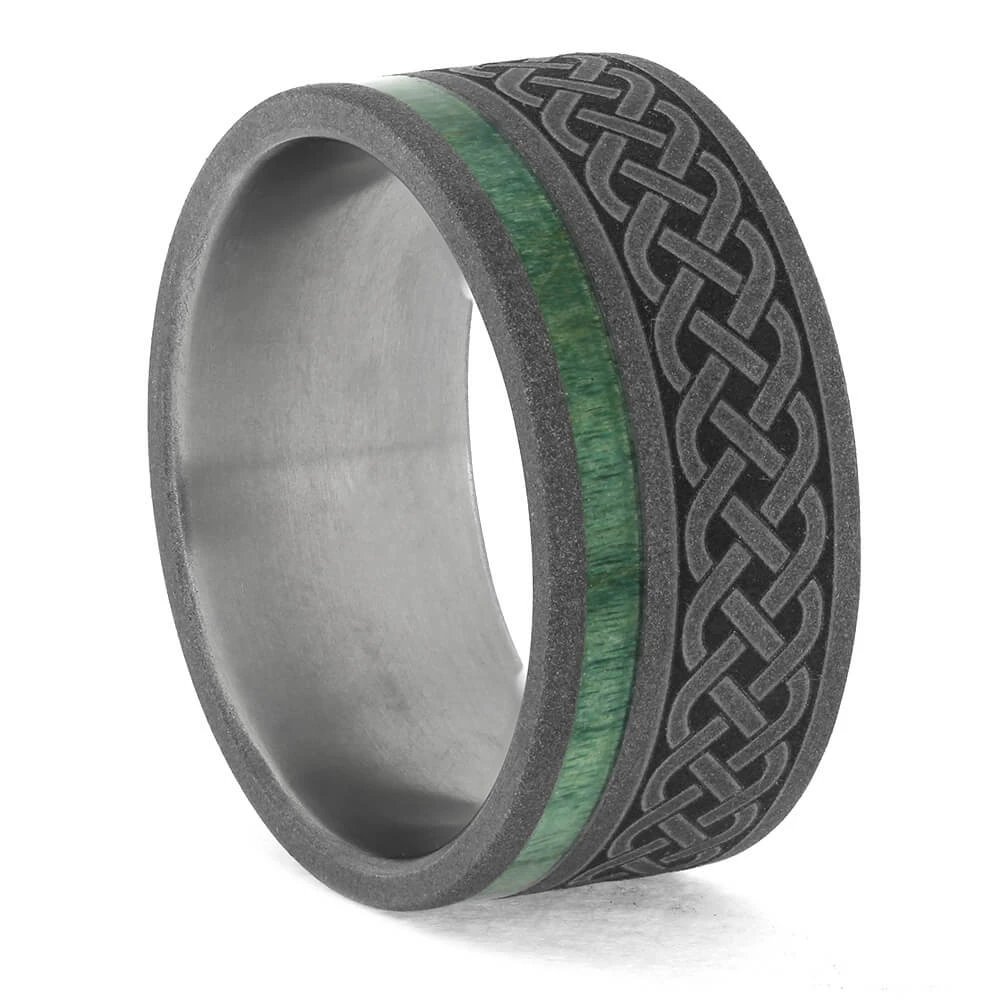 This Celtic knot wedding band is expertly crafted with green wood, embellished with a mythical engraving, and completed with a sandblasted texture for an infinite, timeless look.