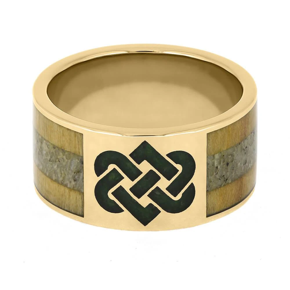 This solid 14k yellow gold ring features a combination of rare elements, including a Celtic knot embellished with crushed peridot stones. The birch and deer antler inlays on the band add to its masculine and broad design, making it the perfect choice for a groom with a deep ancestral ties.