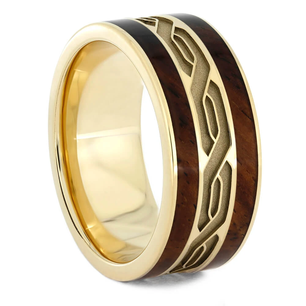 This Celtic eternity wedding band is crafted in solid 10k yellow gold, matching the rugged tones of the exotic, masculine Honduran rosewood burl. The wide shape of this wood ring makes it an excellent choice for a men’s wedding band.