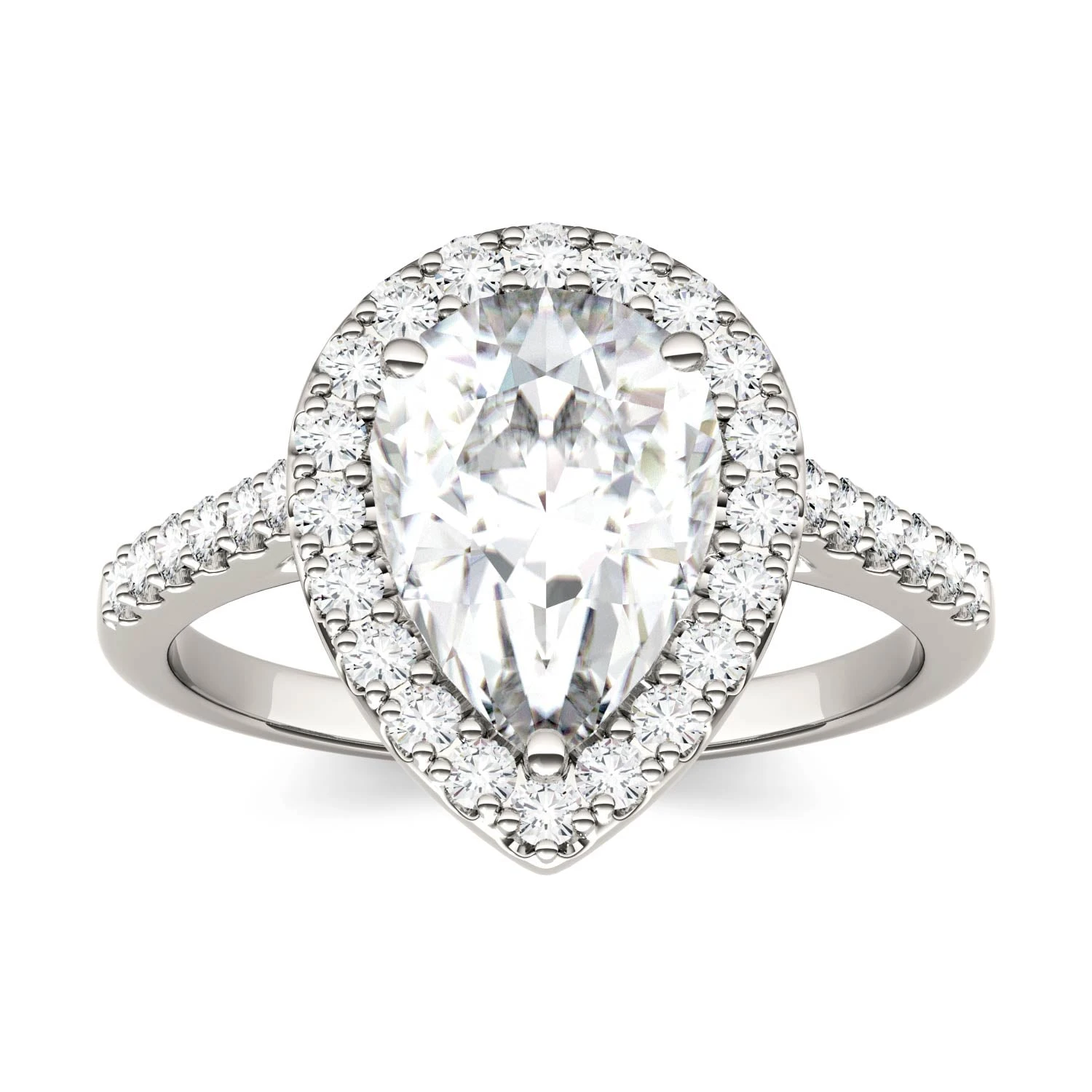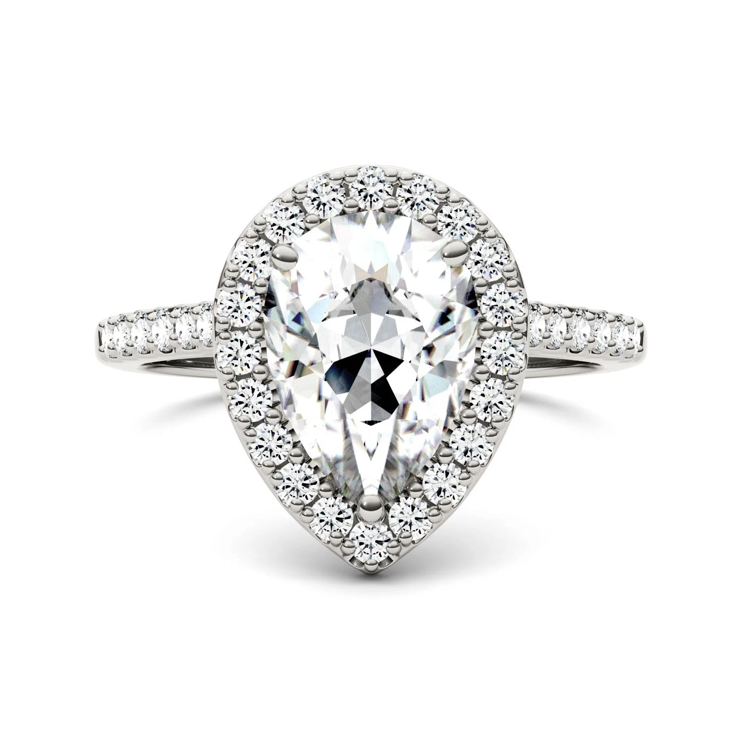 This Charles & Colvard pear cut moissanite catches the light from every angle to stunning effect. It is rimmed by smaller moissanites in a halo formation. Total diamond equivalent weight is 2.58 carats.