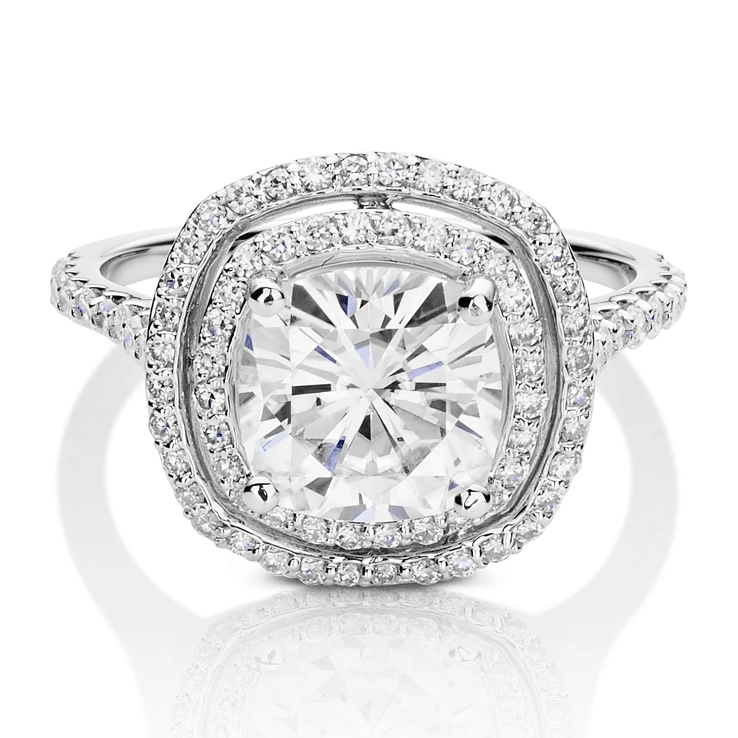 A heavenly design, this 14k white gold double halo engagement ring features an 8 mm cushion cut Moissanite by Charles & Colvard. Additional glittering stones adorn the top of the ring’s shank for a total diamond equivalent of 3.60ctw.