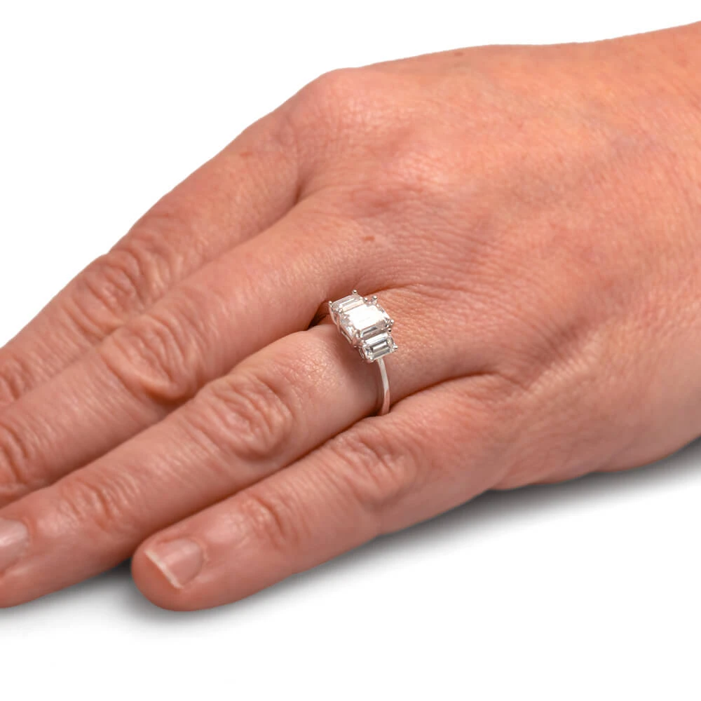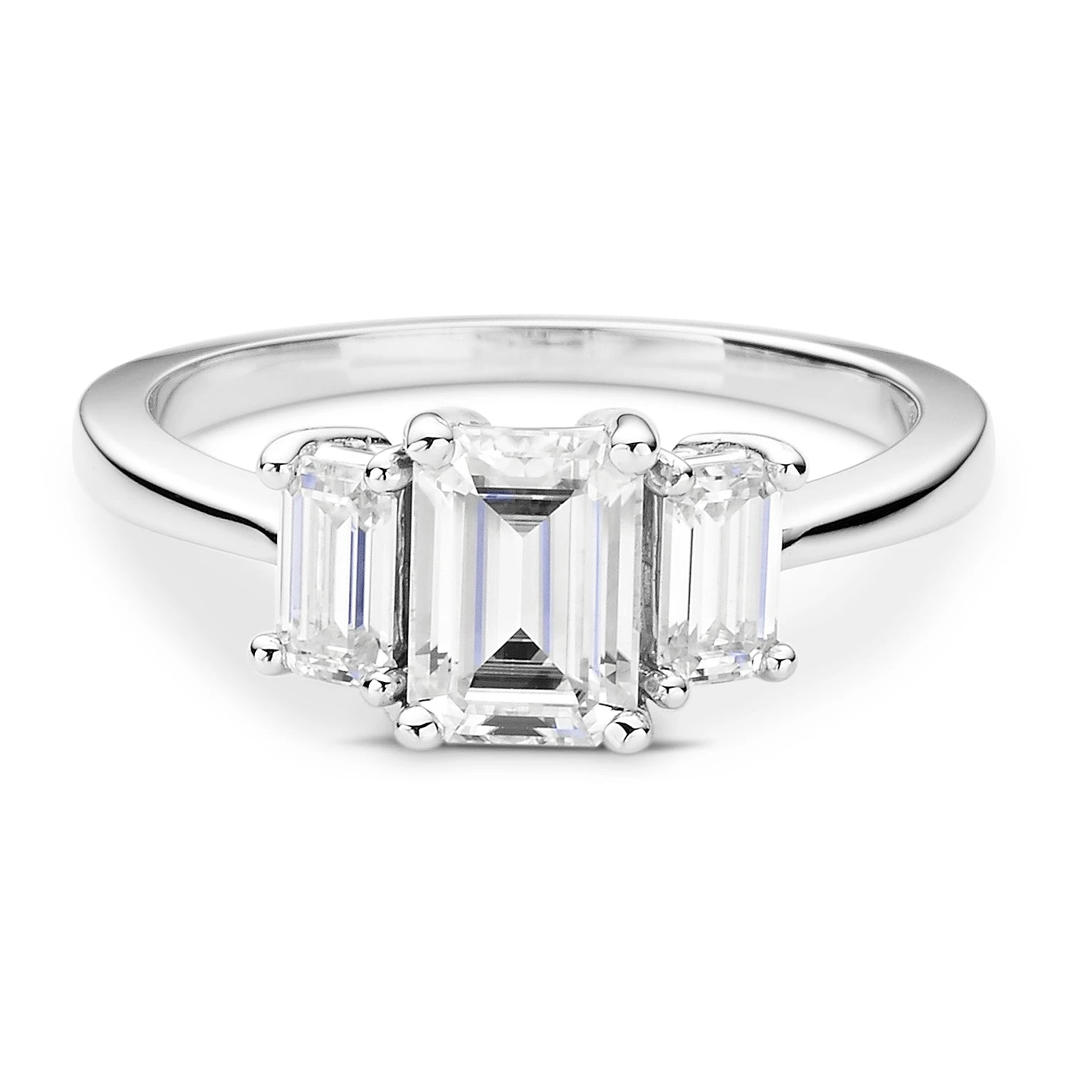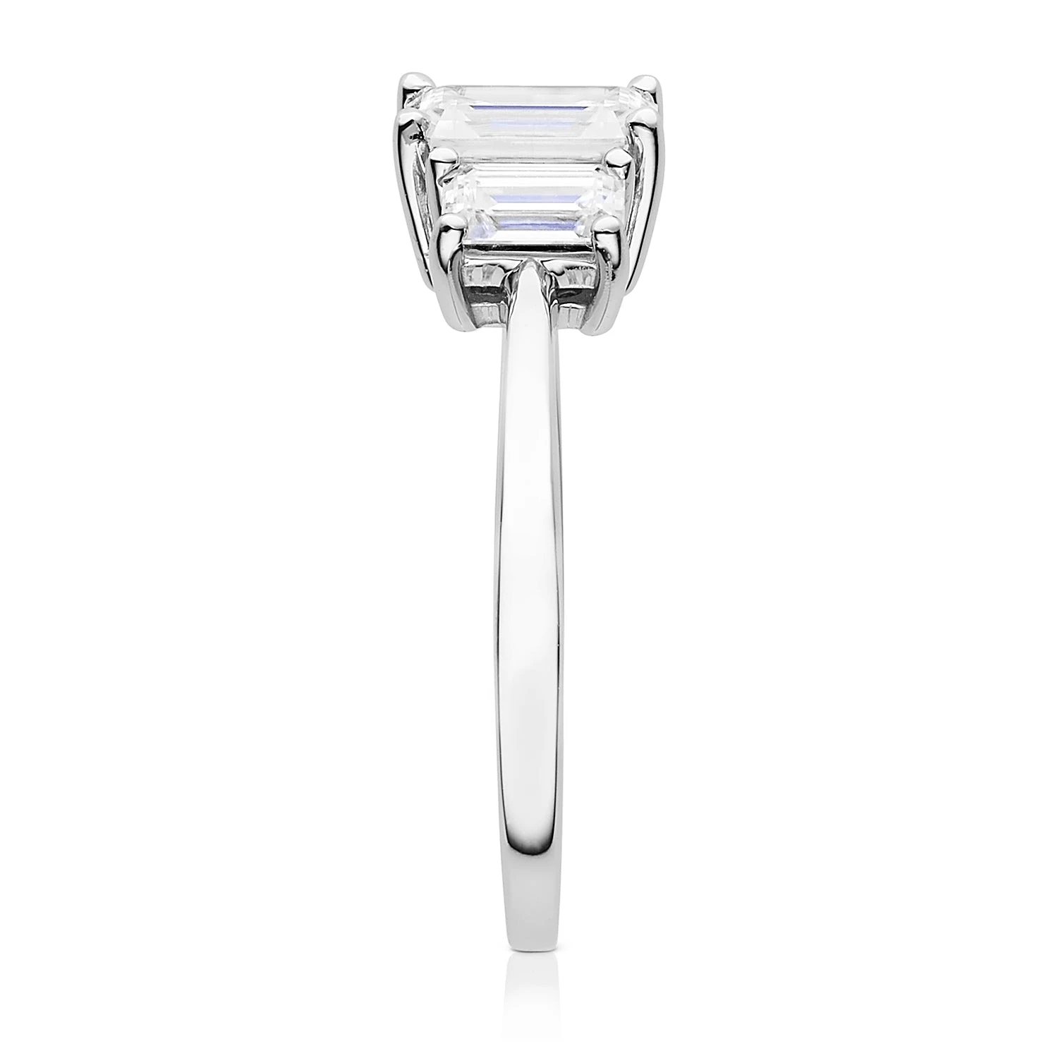 Say “I do” with this dazzling three stone emerald cut engagement ring featuring Moissanite by Charles & Colvard gemstones. Set in elegantly crafted and gleaming 14K white gold. The engagement ring showcases a marvelous emerald cut center stone that is beautifully adorned on either side by two smaller, but equally lovely stones. This design has 1.55ctw diamond equivalent and is a perfect engagement or anniversary ring to represent your past, present and future.