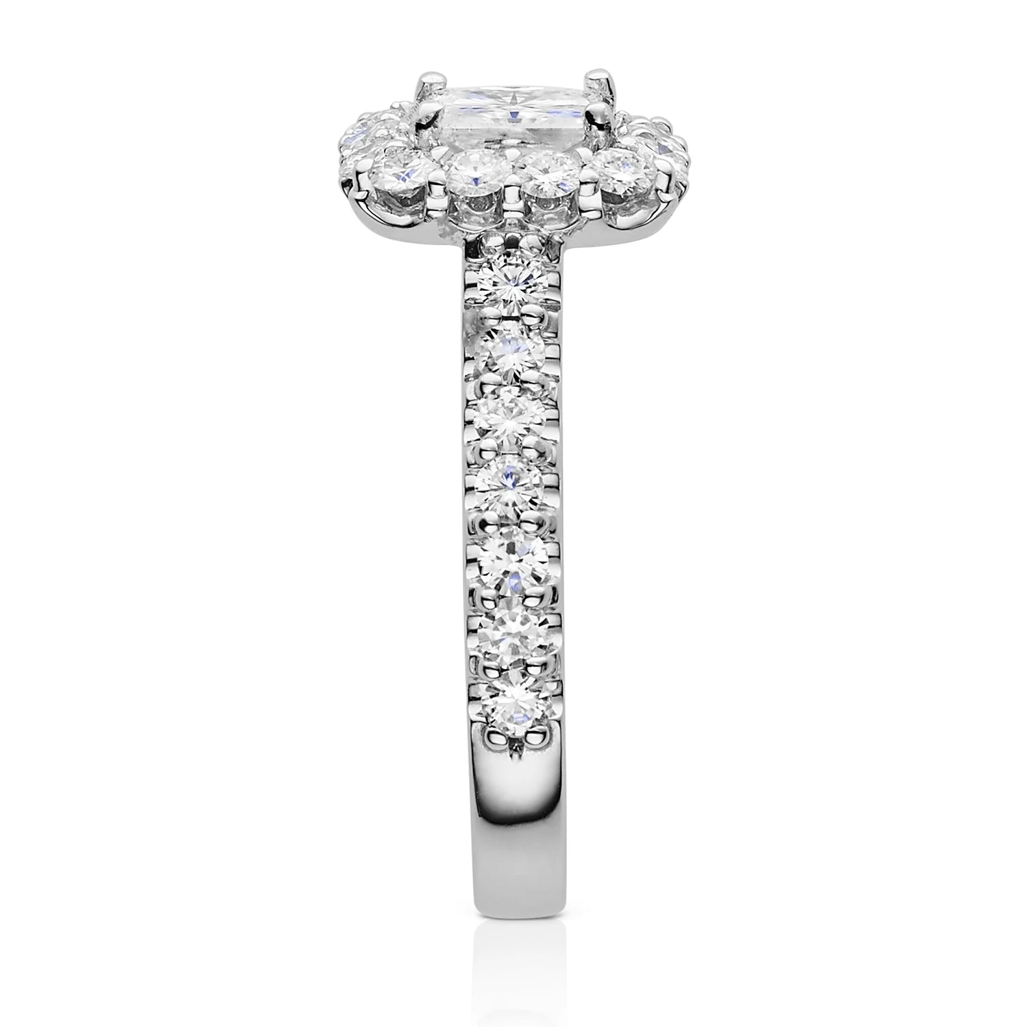 With infinite sparkle, this 14K white gold halo ring features an amazing 5.5 mm square cut center stone beautifully framed by a glittering array of accent stones. Additional Moissanite by Charles & Colvard gems line the ring’s shank for a total of 1.98ctw diamond equivalent.