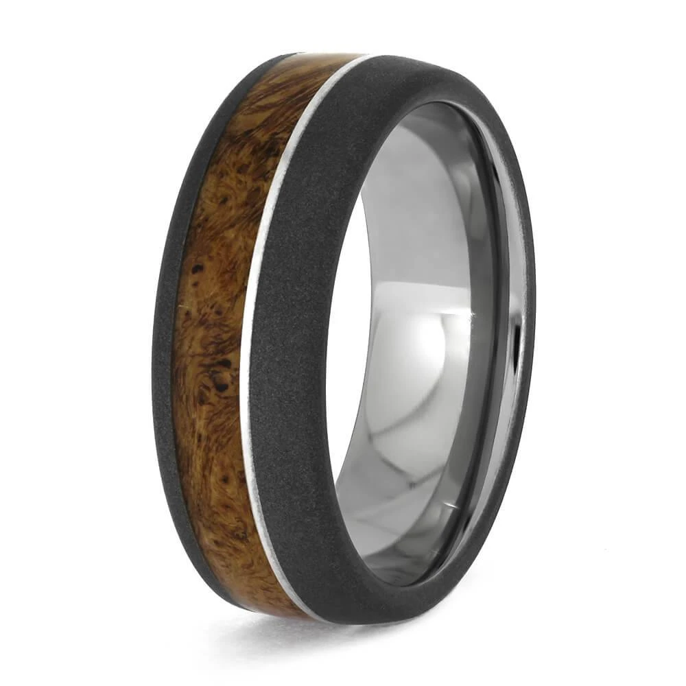Crafted with precision and expertise, this bespoke wedding band showcases titanium with a sandblasted finish, embellished with a vibrant cherry burl wood inlay. The addition of a refined sterling silver pinstripe perfectly accentuates the natural beauty of the wood, making this intricate piece a symbol of your love for the natural world.
