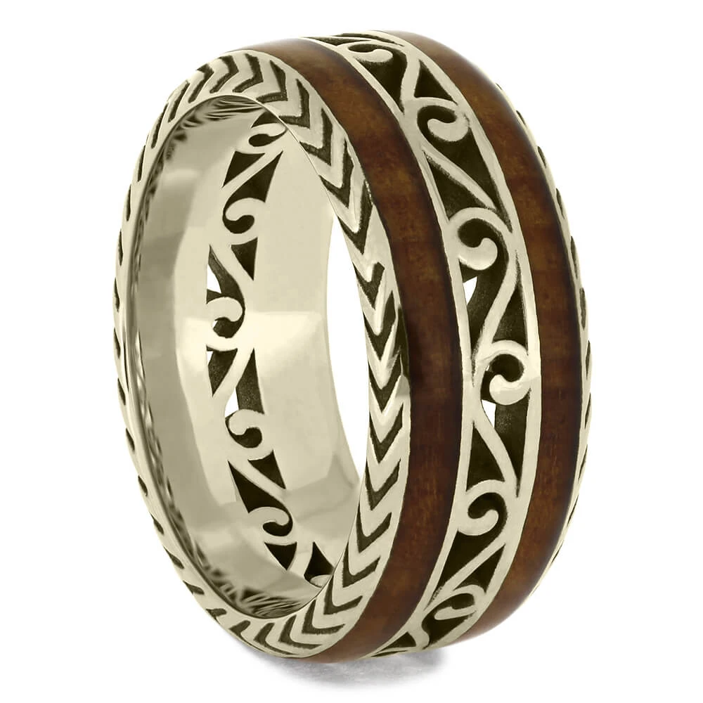 Profess your love or celebrate your everlasting love with this wood wedding band. This 14k white gold ring is vintage-inspired and has a detailed band going all the way around the ring for a special eternity style.