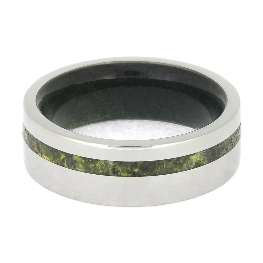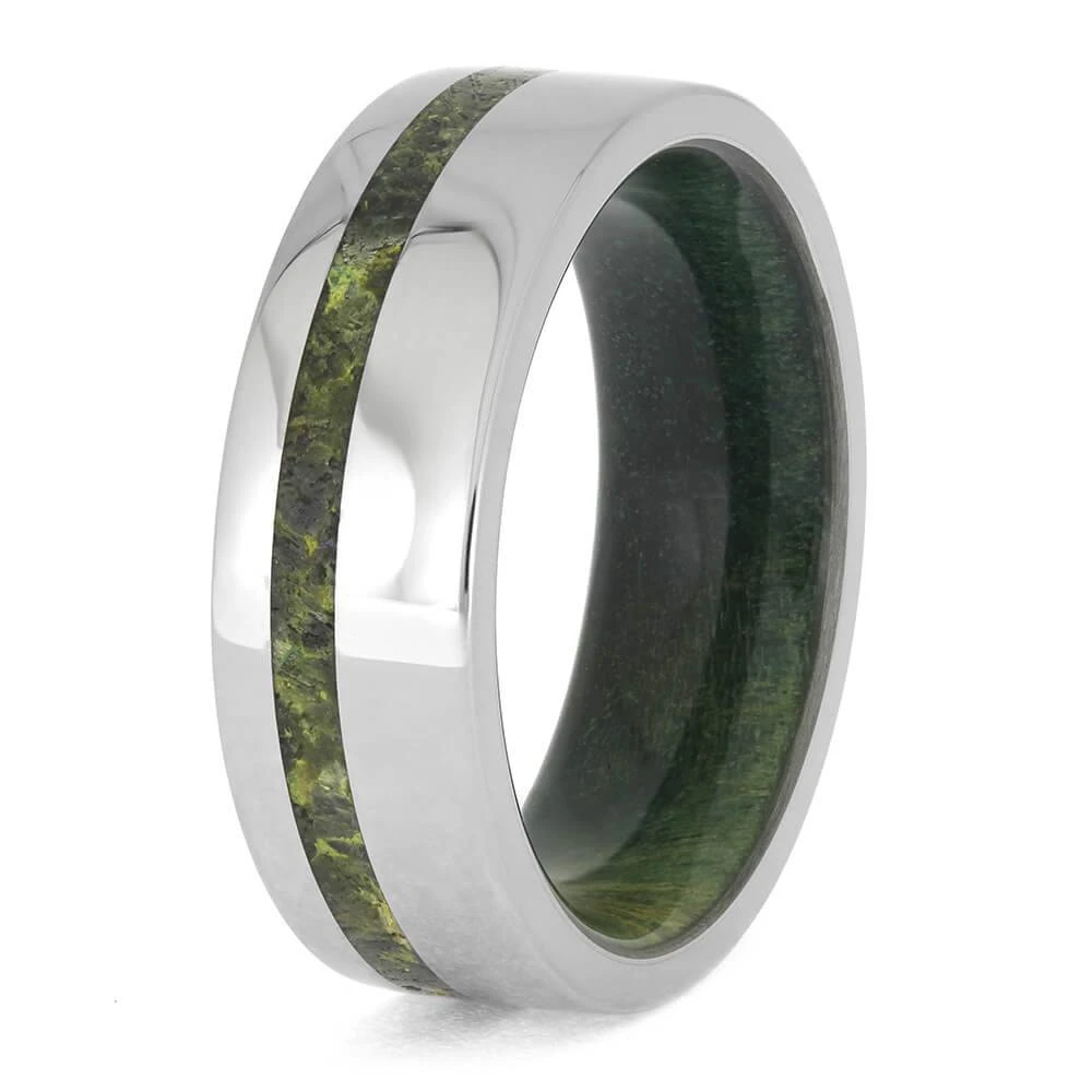 Olive green chrysocolla combines with green box elder burl wood on this handmade wedding band from Jewelry by Johan. The stunning hues of this mineral, a combination of blue and green, are derived from copper ore. Created with titanium, this unique wedding band boasts a lightweight, polished design that is both durable and elegant.