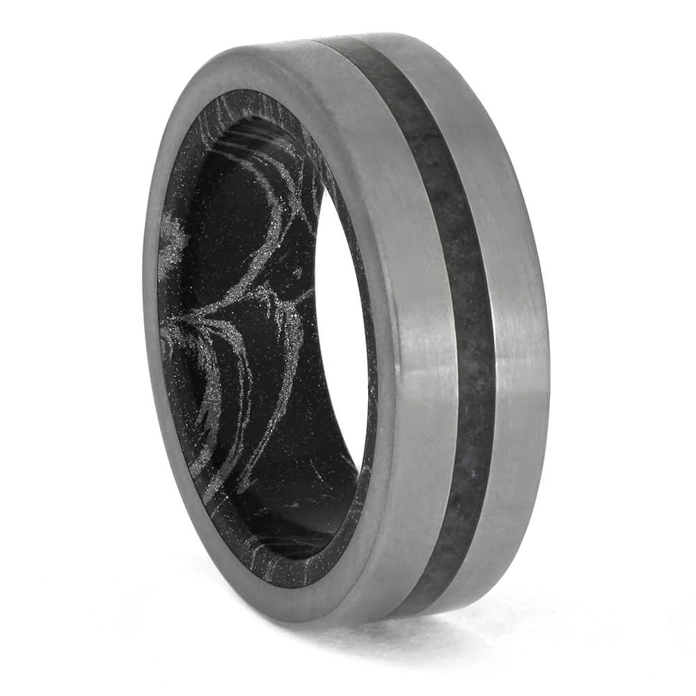 This simple matte titanium ring contains hidden surprises. With a crushed blue sapphire inlay and a composite mokume gane sleeve, this ring is more than what it seems.