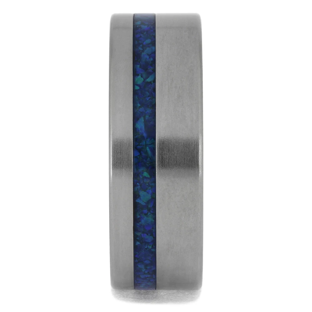 This manly titanium wedding band is accented with a thin crushed synthetic opal pinstripe. The shiny blues from the opal compliments the matte titanium ring finish perfectly, giving this ring a fascinating look.