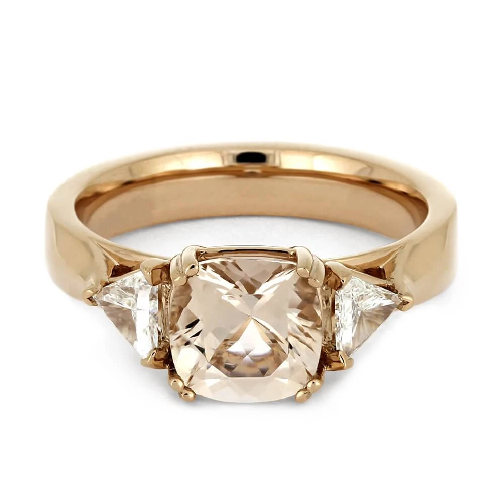 This amazing engagement ring has a three stone design. A beautiful cushion cut morganite is accented by sparkling triangle cut natural diamonds in 14k rose gold.