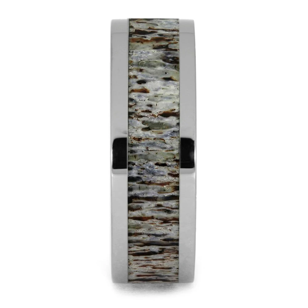 The deer antler inlay on this titanium wedding band goes all the way around, symbolizing your endless devotion to one another and your love of nature. Every antler specimen is unique making your item even more special.