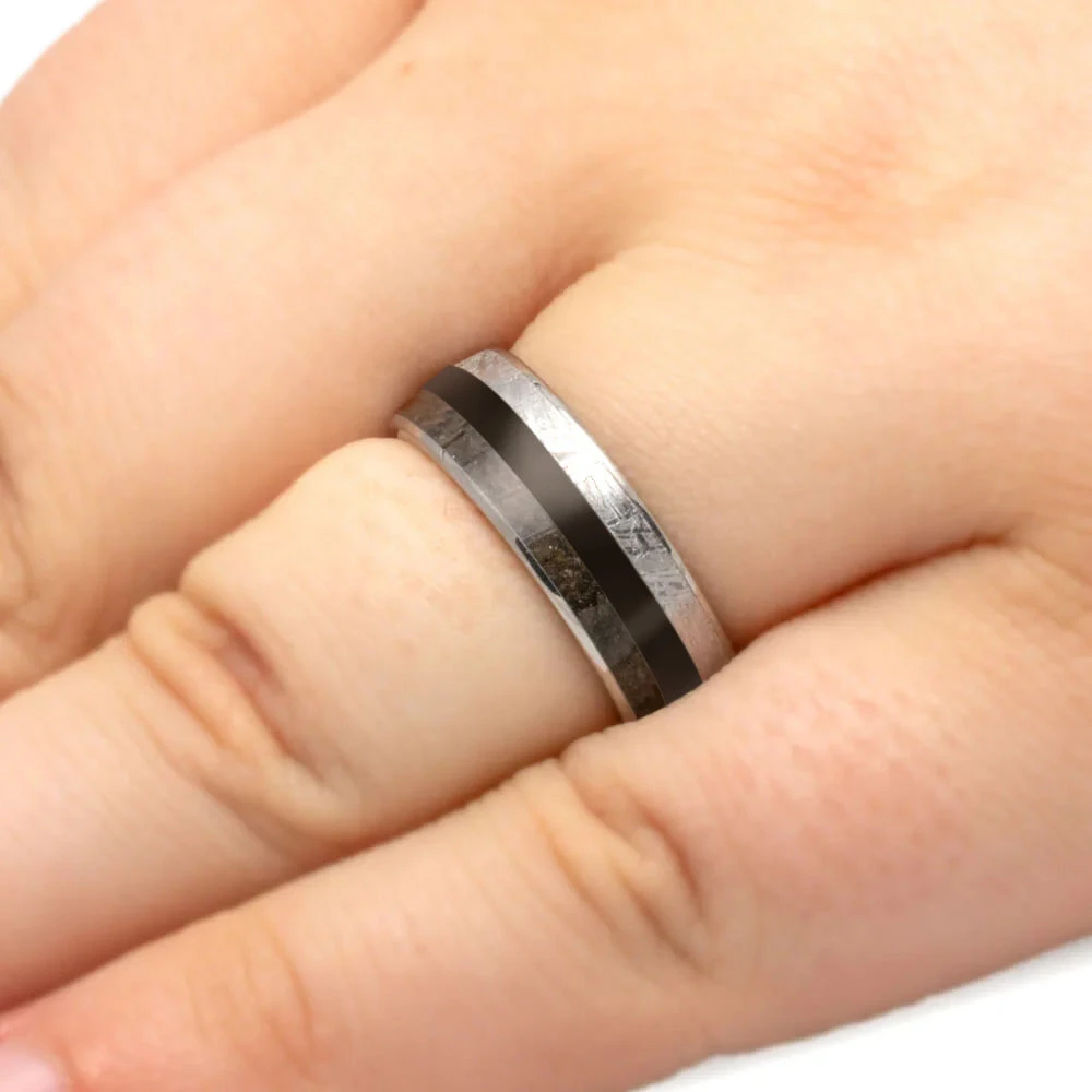 Nature and celestial elements combine to create a bold and masculine look on this meteorite, wood, and dinosaur bone wedding band. Crafted from titanium, this men’s ring features two distinct hardwoods for a striking contrast. Display your appreciation for the natural world with this one-of-a-kind titanium wedding band.