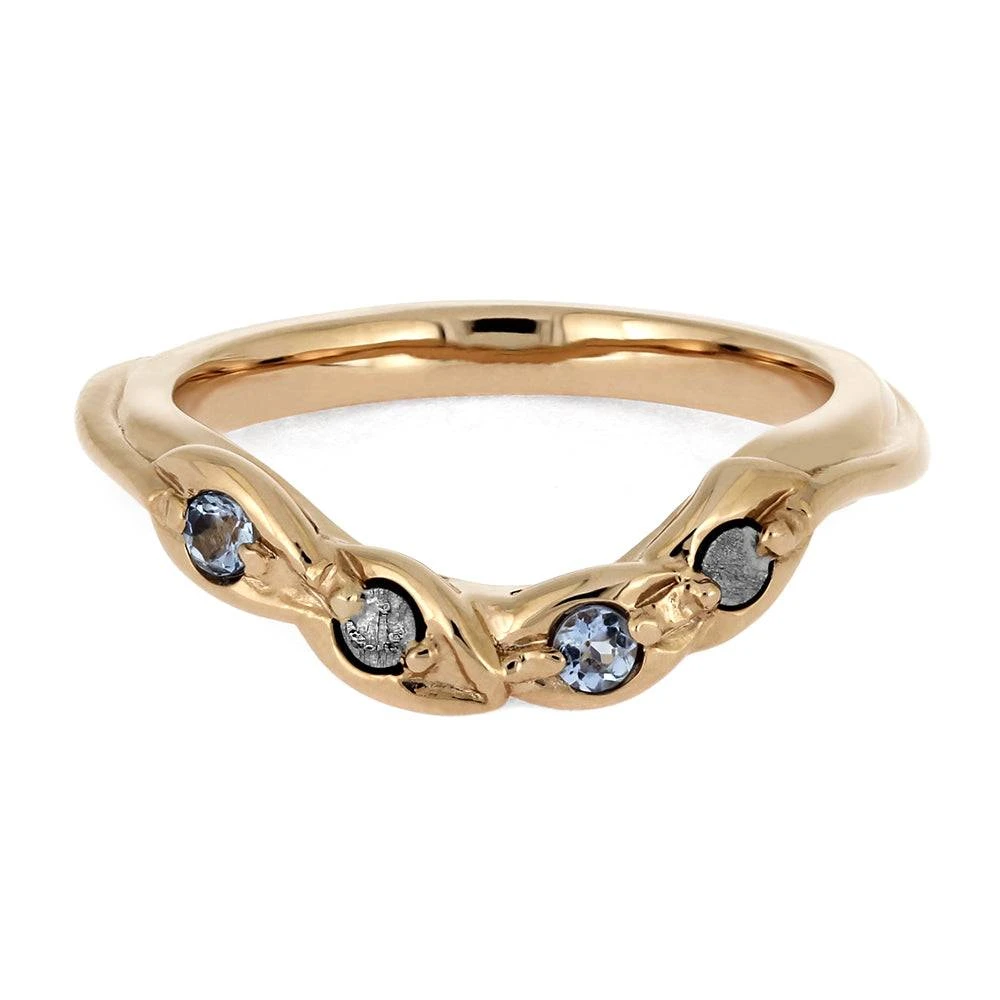 This women’s wedding band has a very unique leaf design accented with meteorite and aquamarine. Customize it to feature a different stone of combination of stones, if desired. View or purchase the entire set here