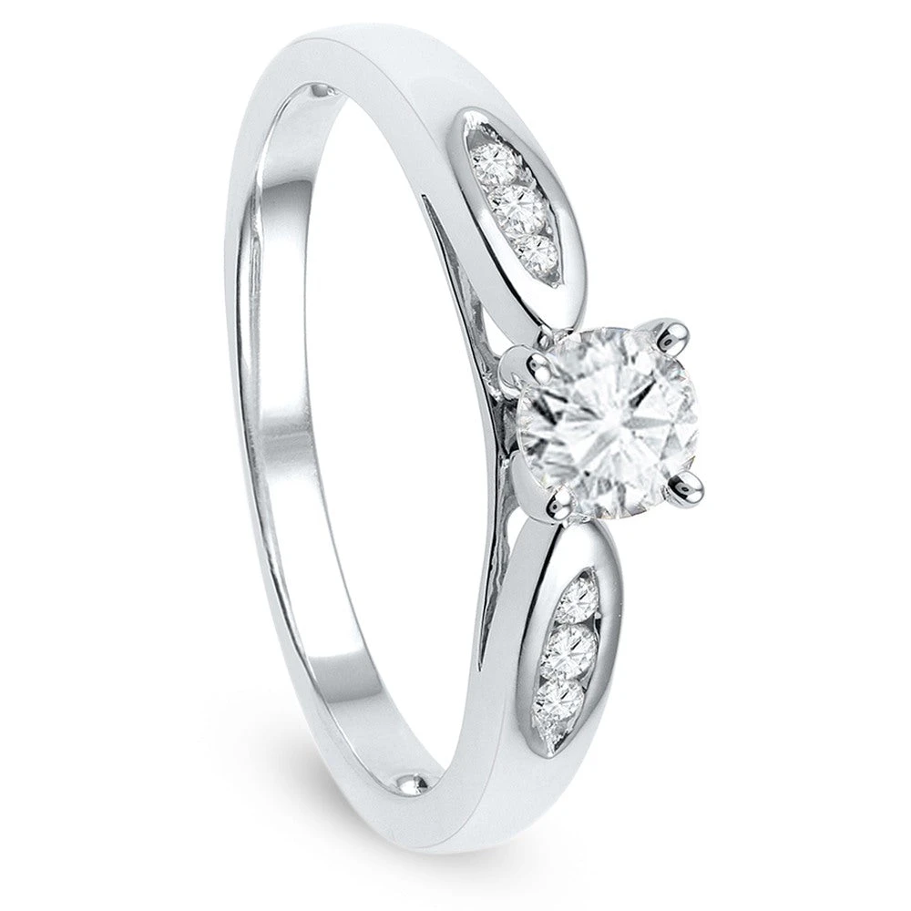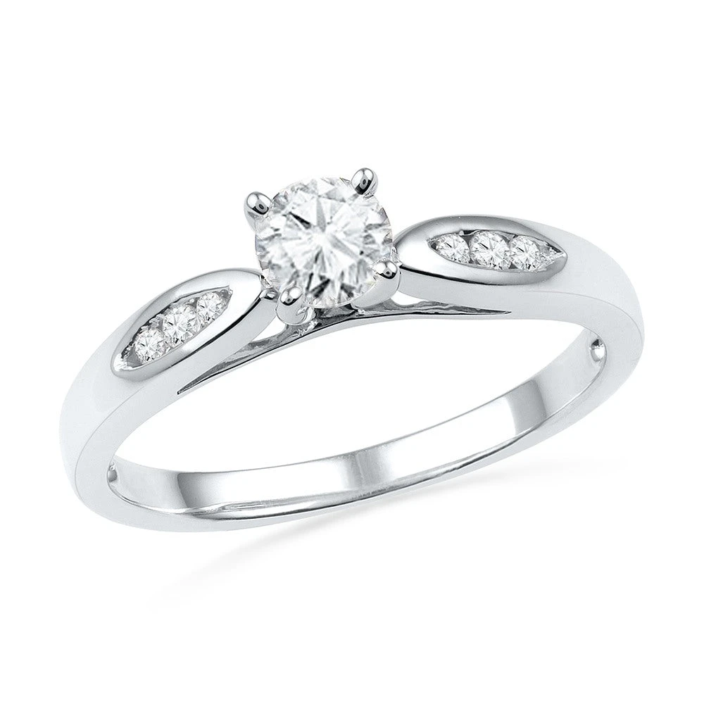This engagement ring has it all! A gorgeous round center stone and diamond accent along the band. These diamonds are placed in a very unique way unlike any other engagement ring. This engagement ring has 1/2 carat total weight of diamonds.