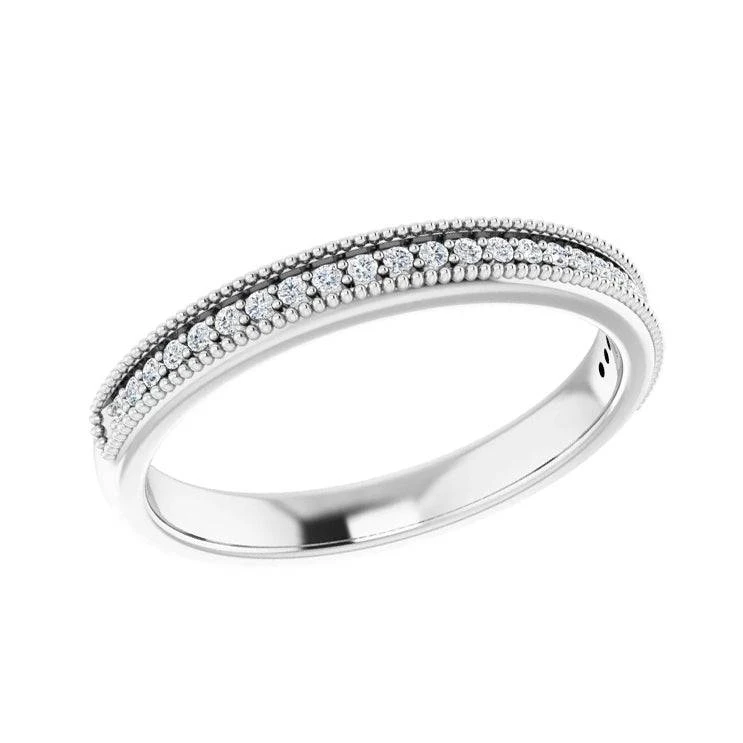 This vintage style diamond band has ornate, milgrain edges framing a row of sparkling diamonds. Crafted in 14k polished gold. Wear this diamond ring alone or pair it with an engagement ring to create a one-of-a-kind bridal set.