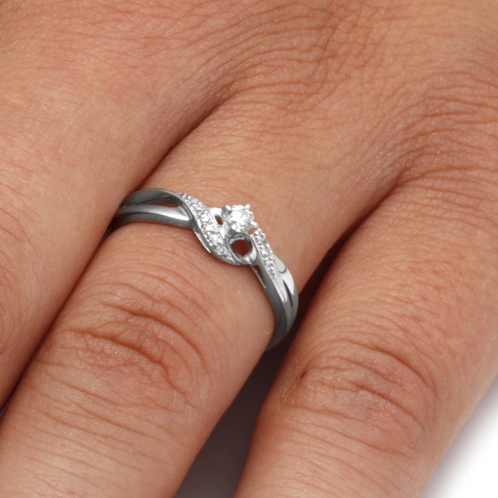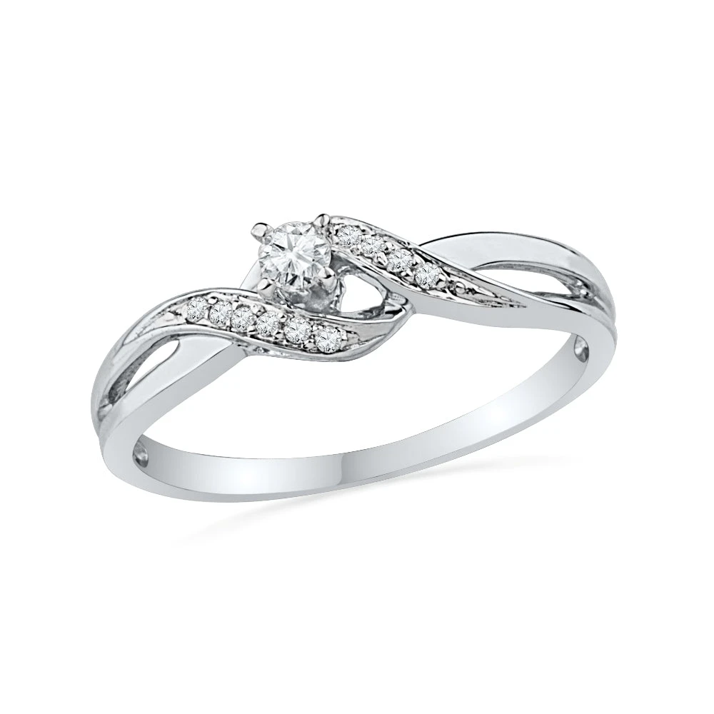 This sterling silver diamond engagement ring is guaranteed to show the one you love just how much you care. The design of this engagement ring is symbolic of putting your love front and center. This engagement ring has 0.12 carat total weight of diamonds and is available in sterling silver.