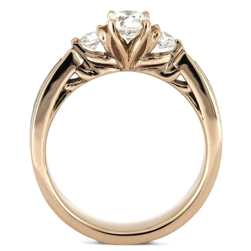Transform the traditional three stone diamond design with turquoise and solid 14k rose gold. Diamonds are always elevated by color, and this gold ring embraces that wholeheartedly with desert mosaic turquoise, one of our exclusive gem alloy materials, which has a beautiful mix of green and blue.