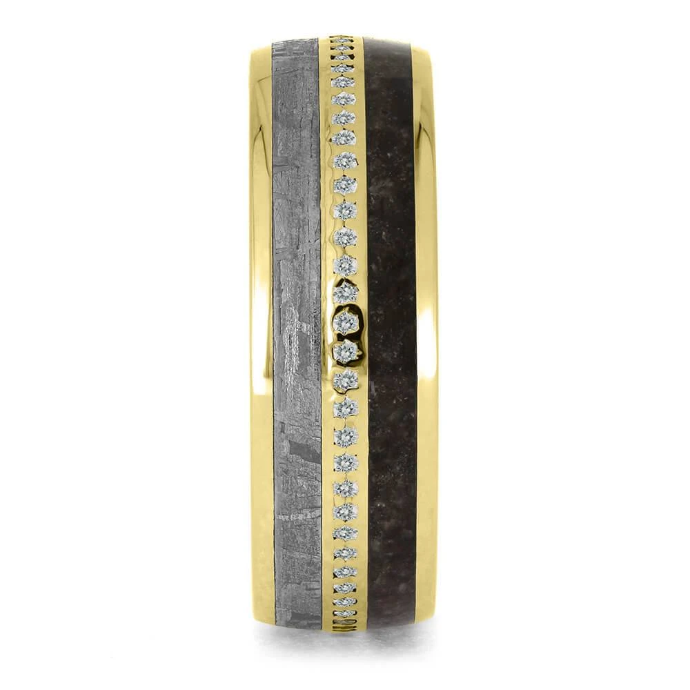Dinosaur bone and meteorite come together in this diamond eternity ring. A meteorite wedding band is an exotic choice for a men’s or women’s ring, perfect for symbolizing your unique love. Every piece of meteorite and dinosaur bone has a unique pattern, making your eternity wedding band one-of-a-kind!
