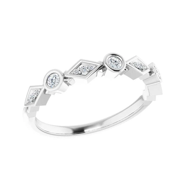 A total of 15 sparkling diamonds in a range of sizes are set in both bezel and prong settings in the unique stackable band. Diamond and circle shapes alternate for a stunning design.