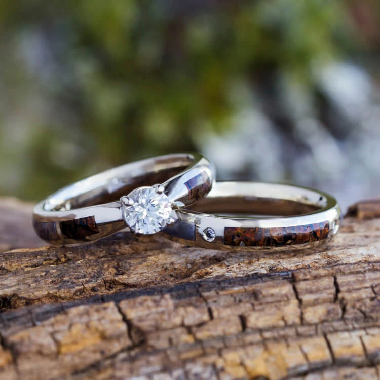 A sophisticated dinosaur bone bridal set made with the finest materials. A round cut white sapphire sits on top of this 10k white gold engagement ring. On the shank lies partial inlays of fossilized dinosaur bone and real Gibeon meteorite. The matching wedding band or wedding ring is set with two diamonds also surrounded by meteorite and dinosaur bone.