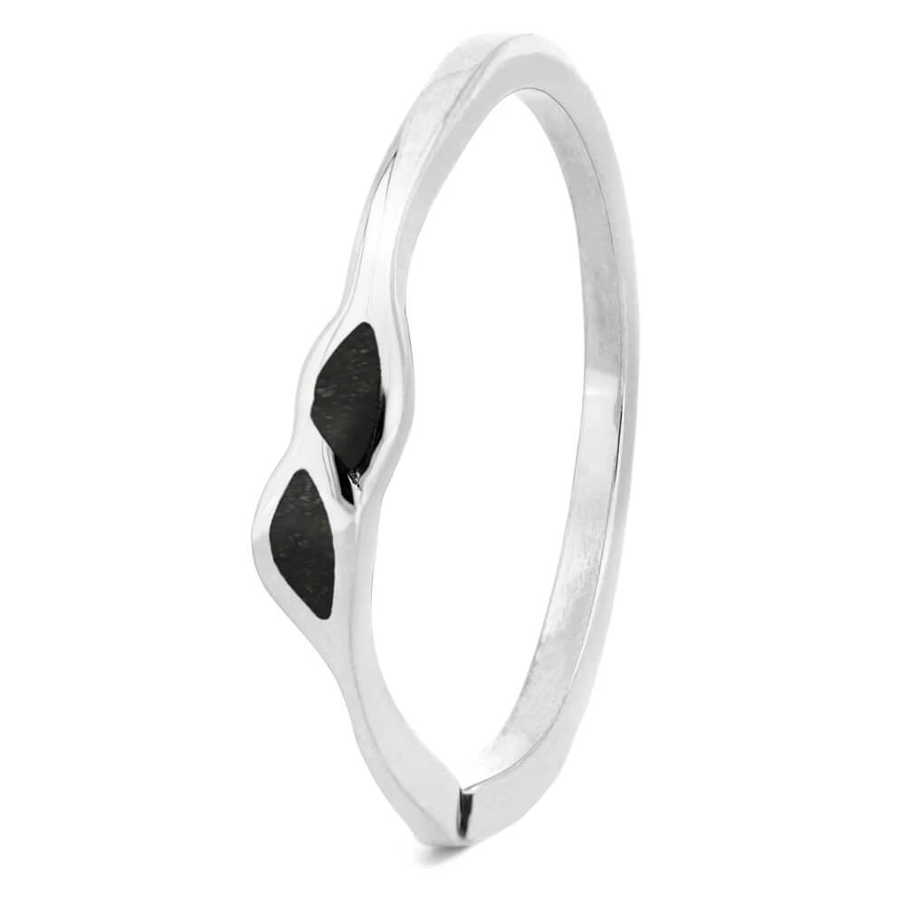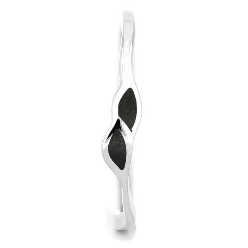 Crushed dinosaur bone fills the leaf-shaped sections of this sterling silver wedding band. You can customize custom, curved band so that it perfectly matches your engagement ring’s shape, such as our twist shank engagement ring design (e.g. SKU 3378) shown in the CAD image example.
